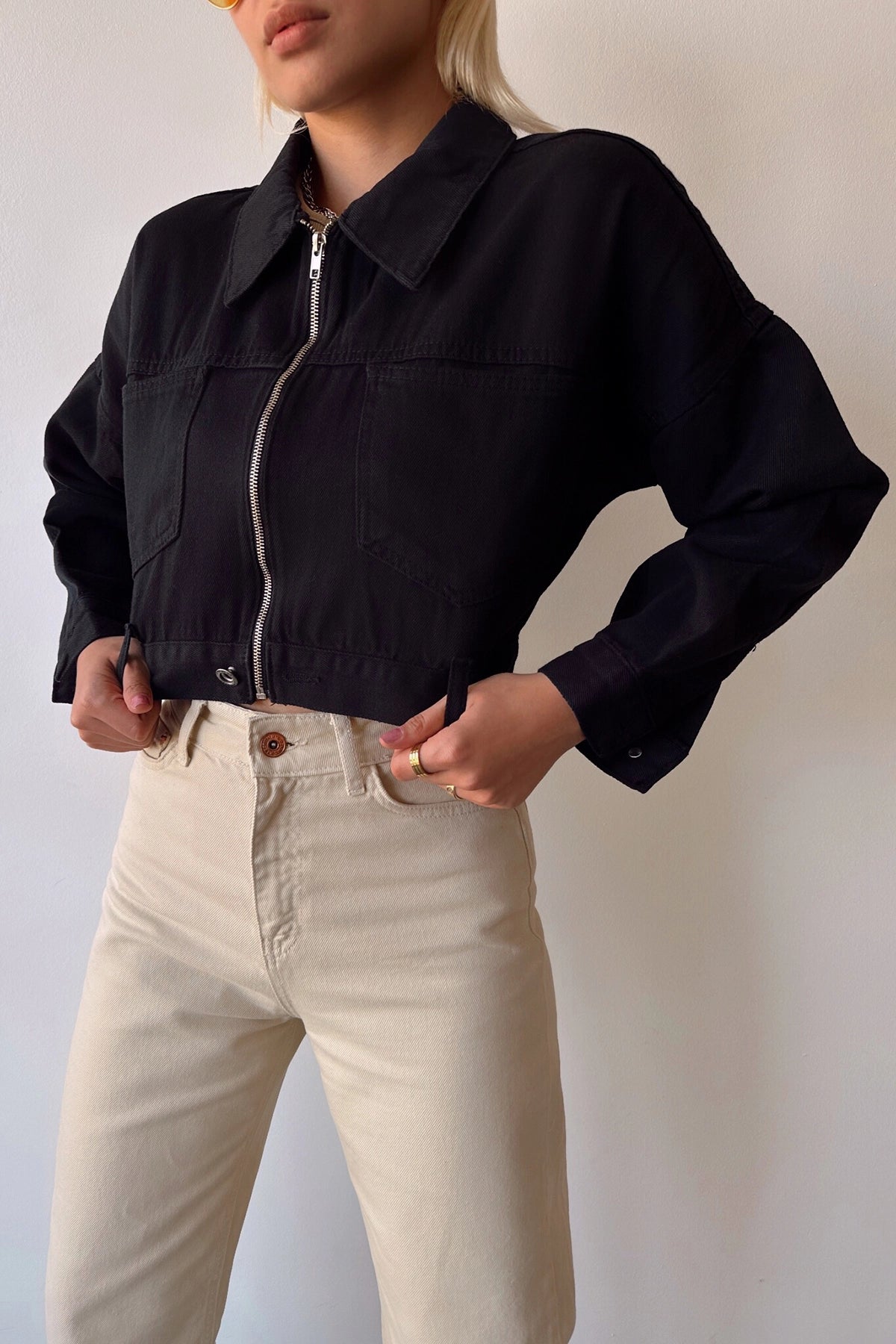 Black Double Pocket Zippered Washed Crop Denim Jacket