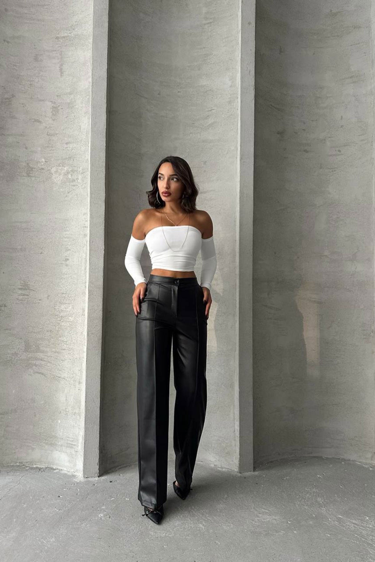 Black Front Seam Detailed Faux Leather Palazzo Pants