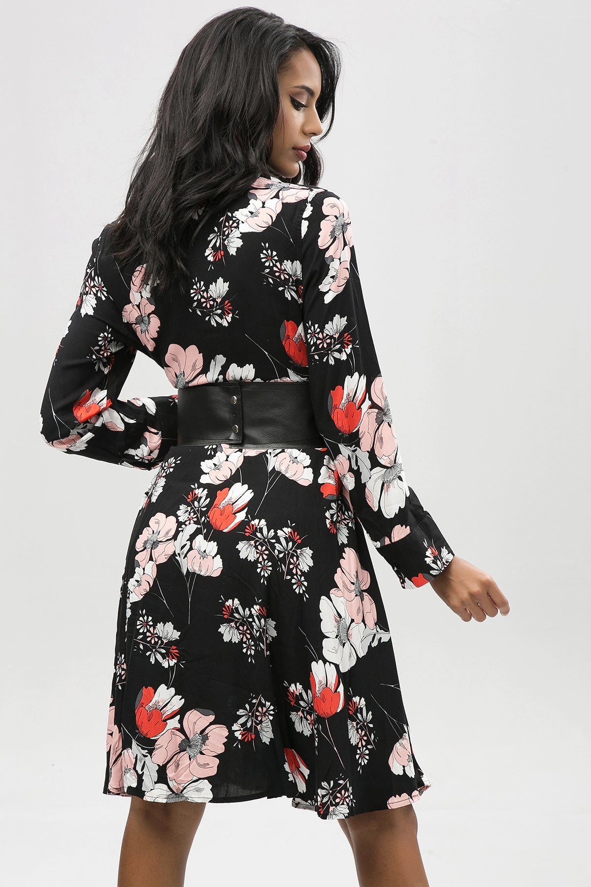 Black Flower Patterned Light Textured Shirt Dress BCBSK-25650-2164 - Pueblo