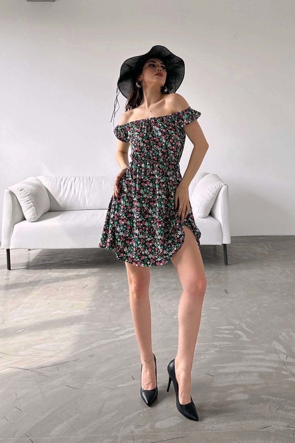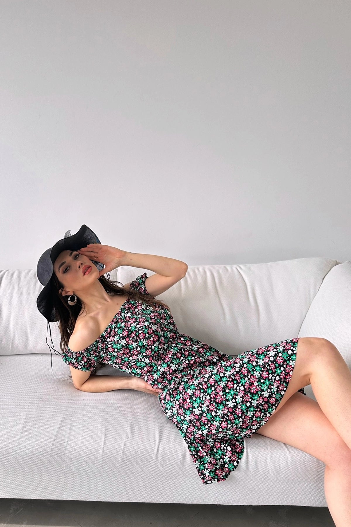 Black Green Madonna Collar Flower Patterned Crinkled Dress
