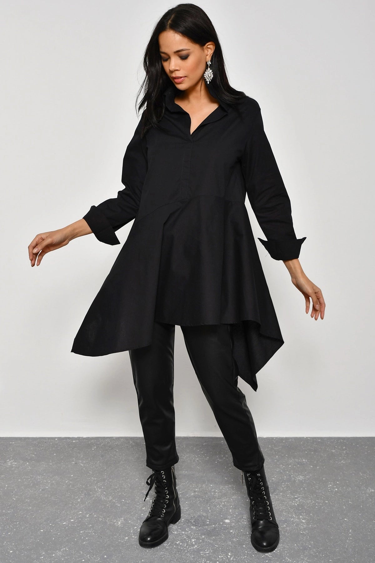This stylish and modern shirt is a must-have piece in every woman's wardrobe! With its black color design, classic collar, and long sleeves, it offers timeless elegance. The asymmetric cut detail adds a special touch that sets the shirt apart from others, while the ruffle detail adds a feminine touch. This shirt is designed in a modest way. It stands out with its oversized cut for you to wear comfortably and freely. Its midi length offers an elegant and practical look. Designed with fabric quality in mind, this shirt offers excellent comfort with its 80% cotton and 20% polyester content. The cotton fabric provides a soft touch to your skin, while the polyester ensures durability and shape retention for the shirt to have a long life. This shirt is a versatile piece that you can easily wear in every season. It is a suitable choice for every style from office elegance to daily outfits. It is an ideal choice for women who value elegance and want to feel special. Black Color Classic Collar Long Sleeve Asymmetric Cut Modest High-Quality Fabric Ruffled Shirt is a perfect choice to complete your style and feel free. With this shirt that offers both comfort and elegance, you will be dazzling at every moment!