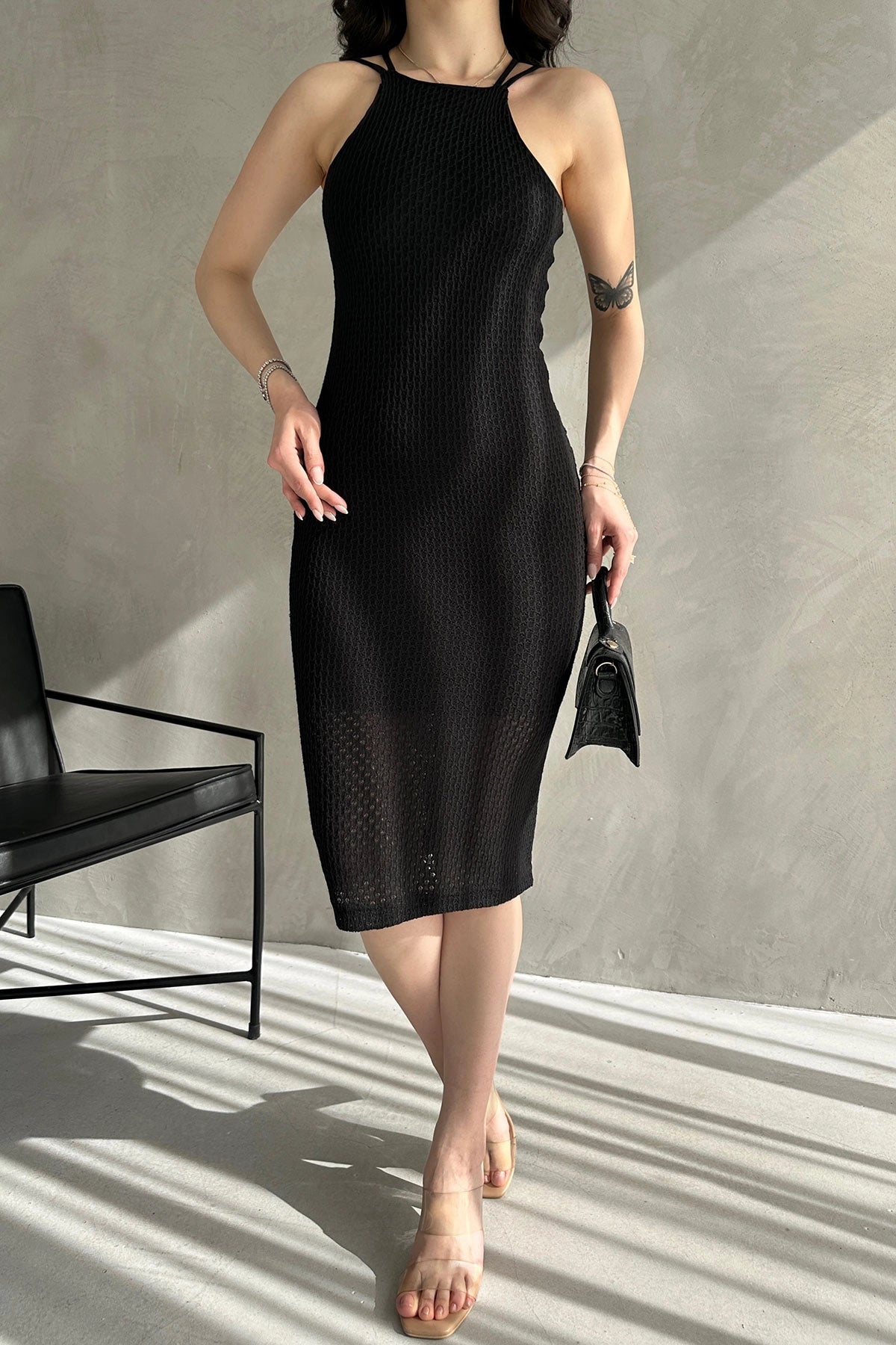 Black Halter Neck Back Cross Strap Detail Knit Dress BCDF-241067 - Mettmann