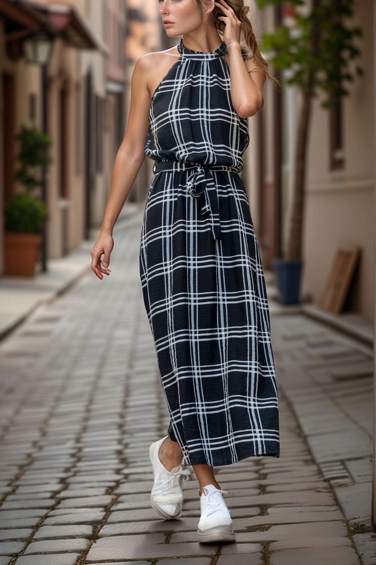 This eye-catching Black Color Daily Style Plaid Pattern Halter Neck Self-Belted Long Dress combines elegance and comfort. Our product is made of 60% polyester and 40% cotton fabric, providing durability and breathability. The black color of the dress reflects the elegance and sophisticated style of black, a timeless classic. Black ensures a stylish look in any situation and offers endless combination possibilities. The plaid pattern design adds character and charm to the dress. The classic and timeless style of plaid ensures you stand out wherever you go. This pattern is an ideal choice for creating an original and stylish look. The halter neck design elegantly accentuates your shoulders and décolletage. This neckline style offers feminine charm while providing comfort. It is a perfect choice for those who want to achieve an extraordinary look. The self-belted design of the dress beautifully accentuates your waist and makes your figure look slimmer. Thanks to this feature, the dress creates an elegant silhouette that highlights your body lines. This long dress is a versatile piece that can be worn in every season. You can combine it with sandals or sneakers for a casual daytime look, or complete it with high heels for a stylish evening event. This Black Color Daily Style Plaid Pattern Halter Neck Self-Belted Long Dress is a perfect choice for reflecting your style. This dress, which combines comfort and elegance, will be an indispensable part of your wardrobe.