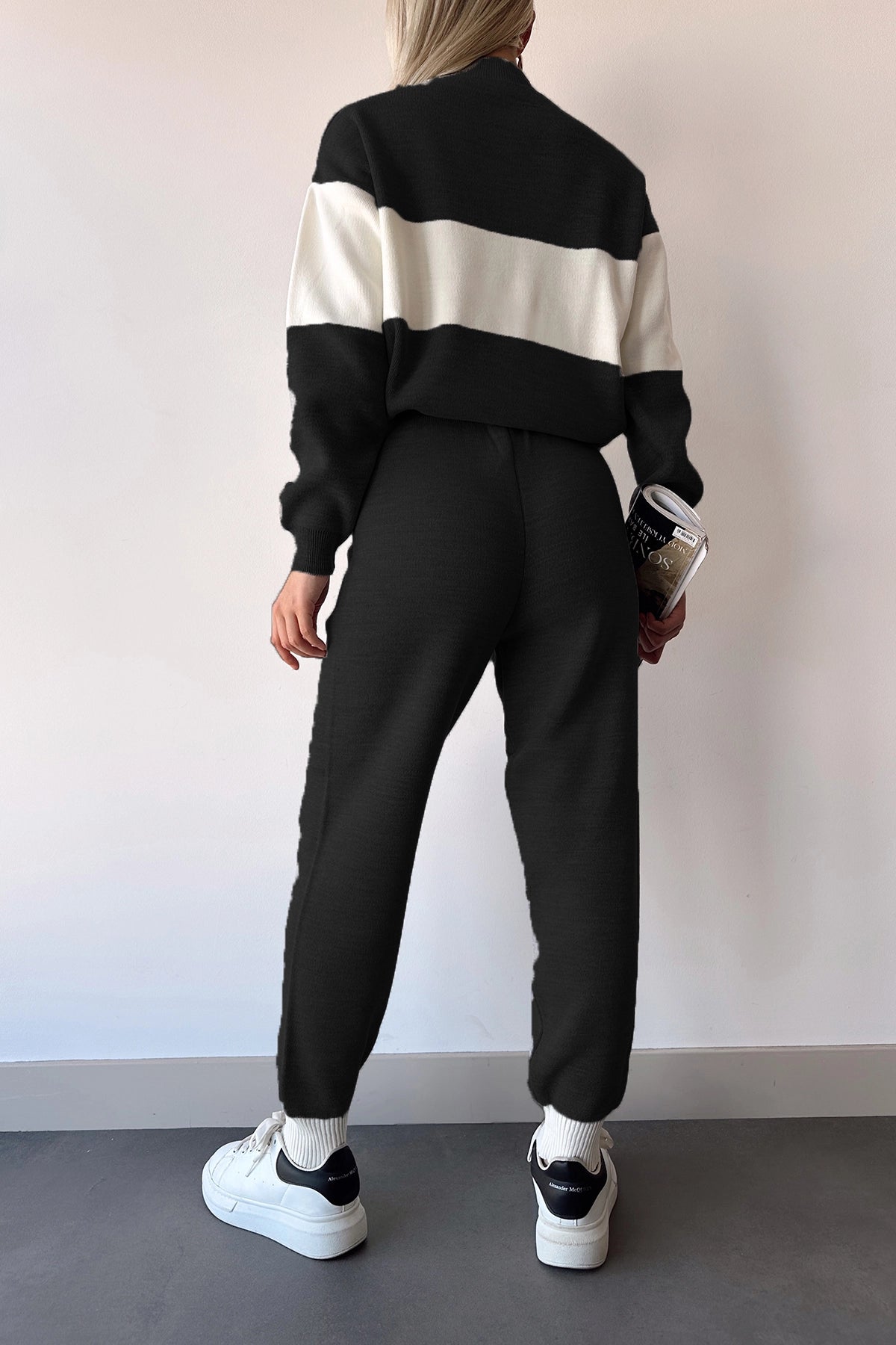 Black High Neck Striped Block Knitted Top Bottom Tracksuit