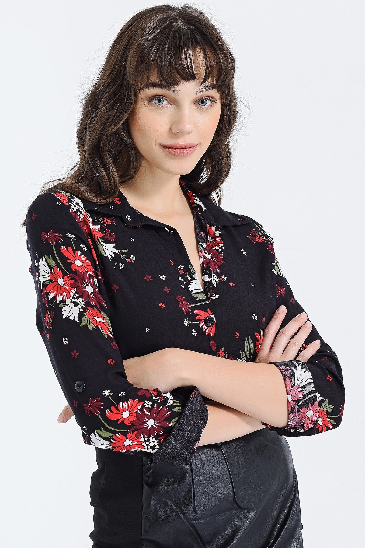 Black Color Modern Style Flower Patterned Long Sleeve Shirt is a perfect choice for those seeking elegance and comfort. The fabric of this shirt is made of 60% polyester and 40% cotton, providing durability and breathability. The fabric content ensures that the shirt has a soft and smooth touch while also offering easy maintenance. Polyester maintains its durability over time, while cotton provides comfort to your skin and enhances breathability. The black color of this shirt allows you to stand out with its modern style while also offering a classic look. Black is a perfect choice for every season and occasion. The flower patterns on it add an elegant touch to the shirt. These patterns make the shirt more vibrant and attractive while emphasizing your modern style. The long sleeve design keeps you warm in cold weather while also offering a stylish look. This shirt can accompany you in every situation from daily wear to special events. Black Color Modern Style Flower Patterned Long Sleeve Shirt is an easy-to-style piece that can adapt to various styles. It pairs perfectly with jeans, skirts, or stylish trousers. This shirt is an ideal choice for those seeking comfort and quality while reflecting your style. You must have this shirt in your wardrobe, which combines elegance and modernity.