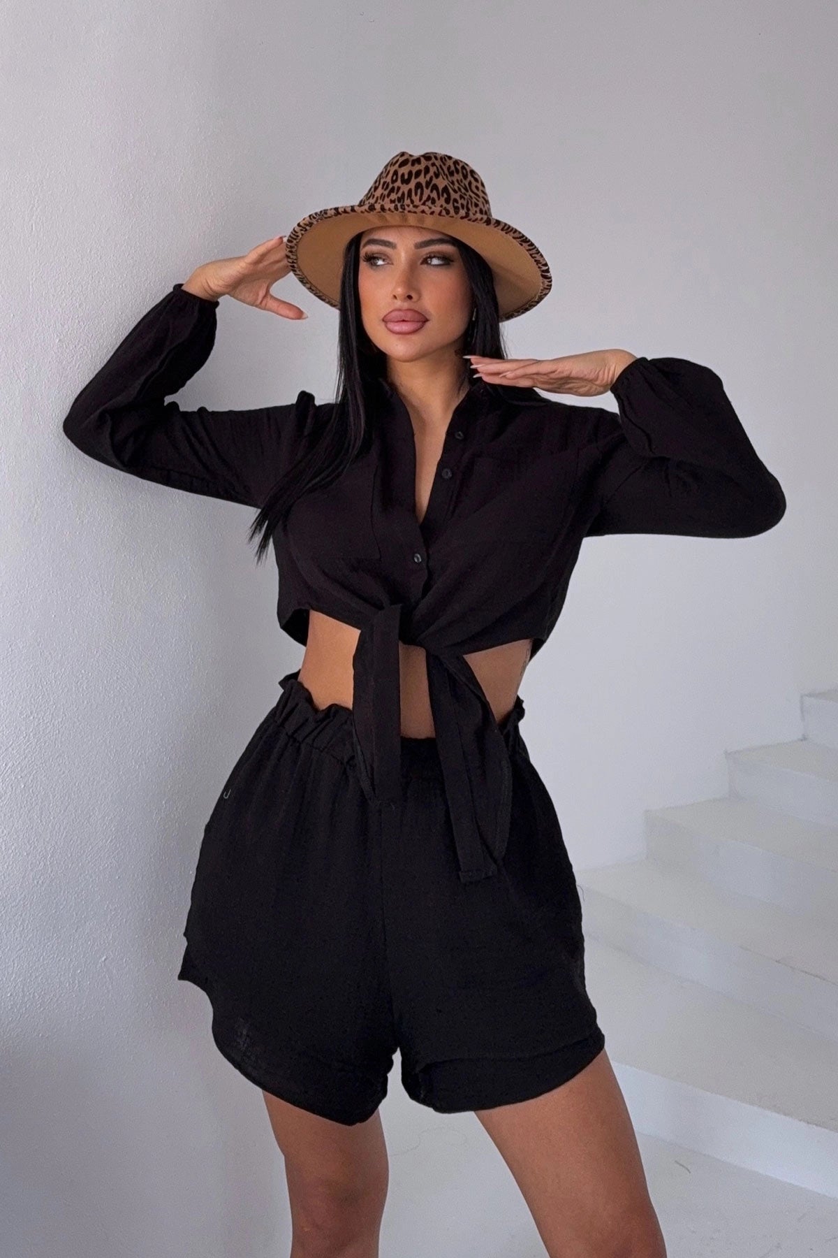 Black Muslin Linen Shorts Suit