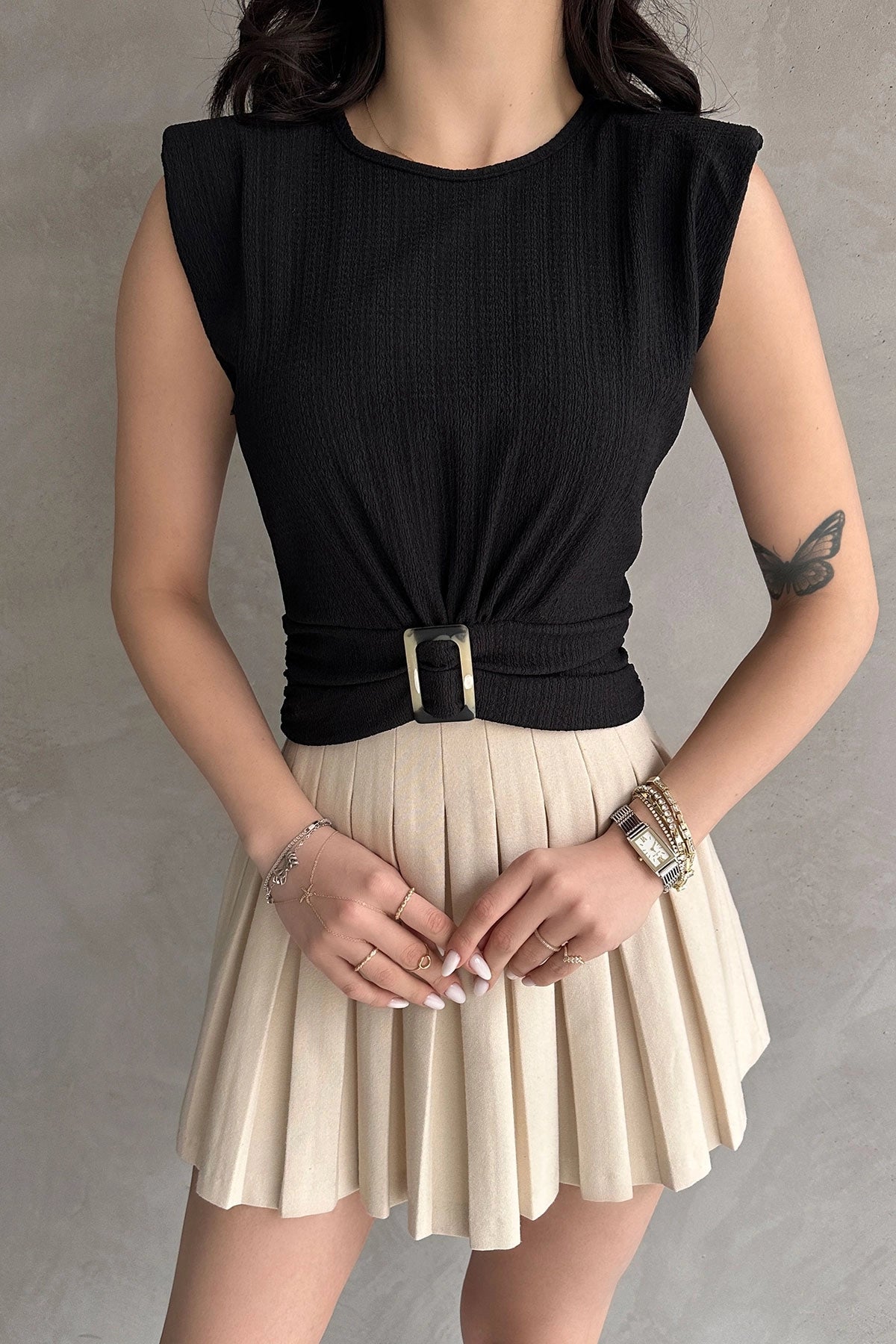 Black Padded Shoulder Belted Ruffled Blouse BCDF-252164 - Rocky Mount