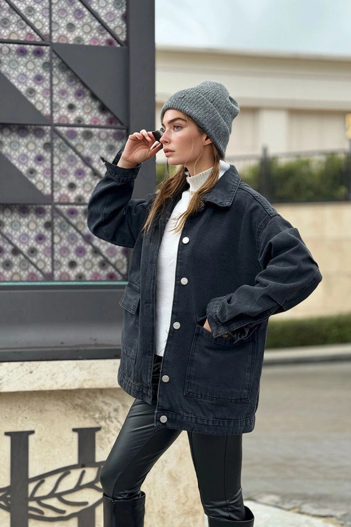 Black Pocketed Oversized Crop Denim Jacket BCBSK-25700-KT001 - Millcreek