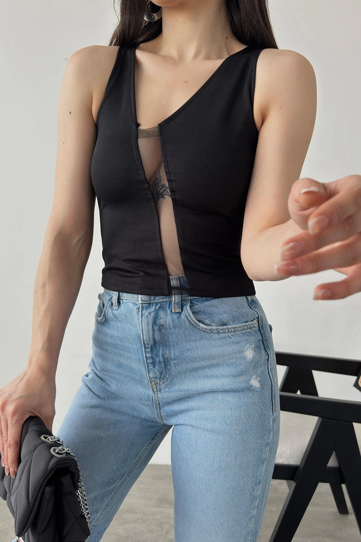 Black Tulle Detailed Sleeveless Blouse with Chest Decollete