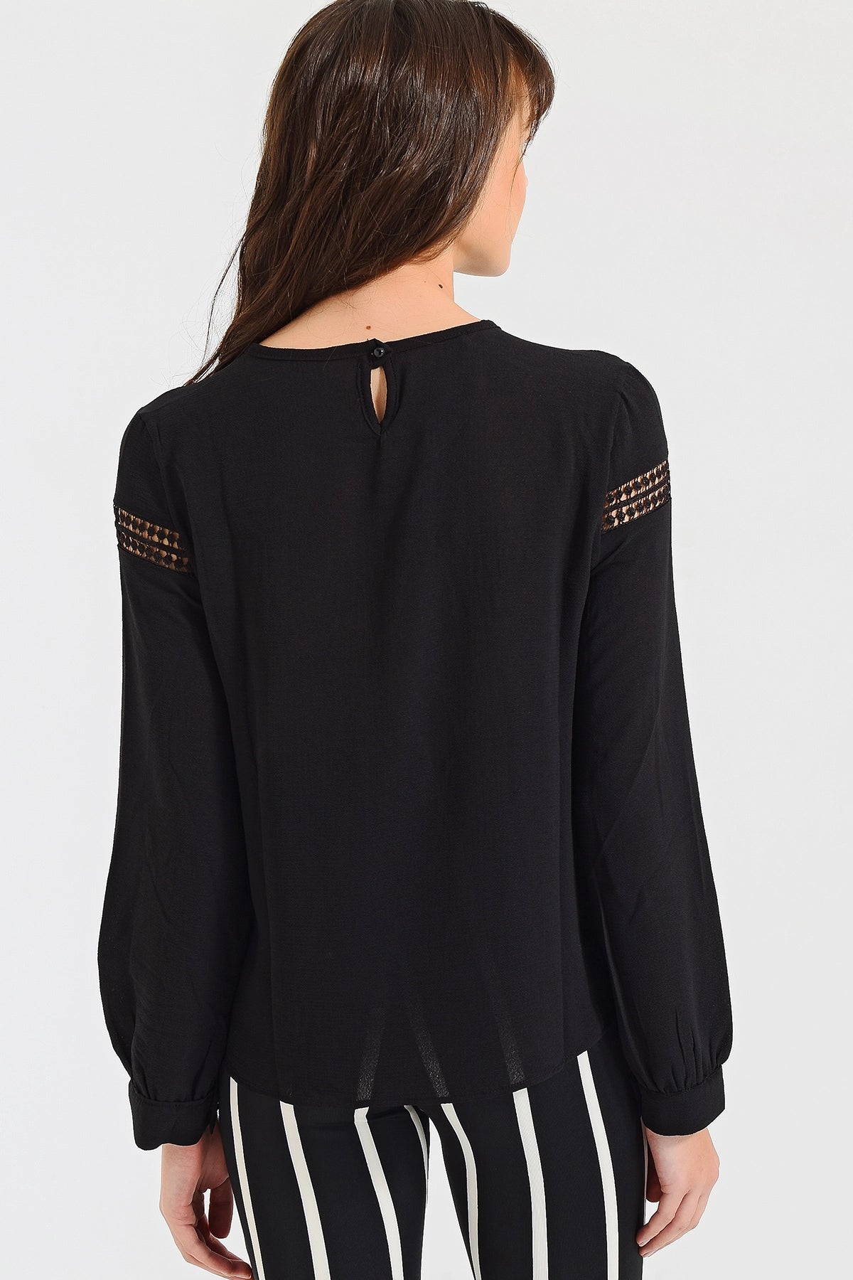 This magnificent blouse perfectly combines elegance and comfort. Its black color design makes it an ideal option for every season and every outfit. This blouse has a modern style with its round neck detail. The detailed lacework adds an elegant touch to the blouse. Its long sleeves will keep you warm in cold weather while completing your elegance. The fabric content is 95% cotton and 5% lycra, providing a soft and breathable texture. Cotton gives a pleasant feeling to your skin, while lycra provides flexibility and freedom of movement. This combination allows you to wear the blouse comfortably all day long. The standard size of this blouse is designed to fit every body type, making it a perfect choice for individuals with different body types and styles. In short, this black long-sleeved blouse combines elegance and comfort with its lace details and comfortable cut. With its 95% cotton and 5% lycra content, this blouse offers you perfect harmony and comfort. You can make this blouse, which will look great with any outfit, a staple in your wardrobe.