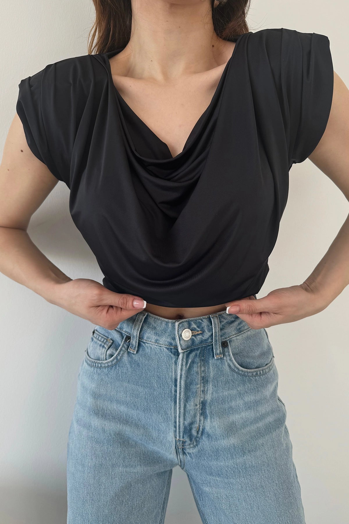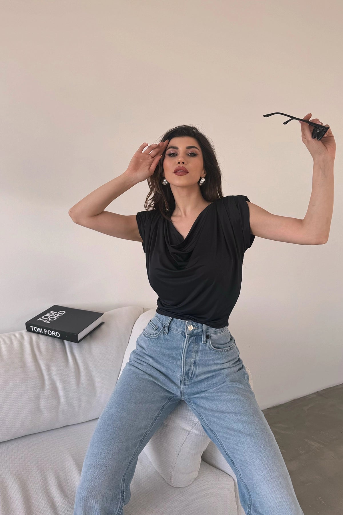 Black Soft Textured Summer Blouse with Deep V-neck and Shoulder Pads