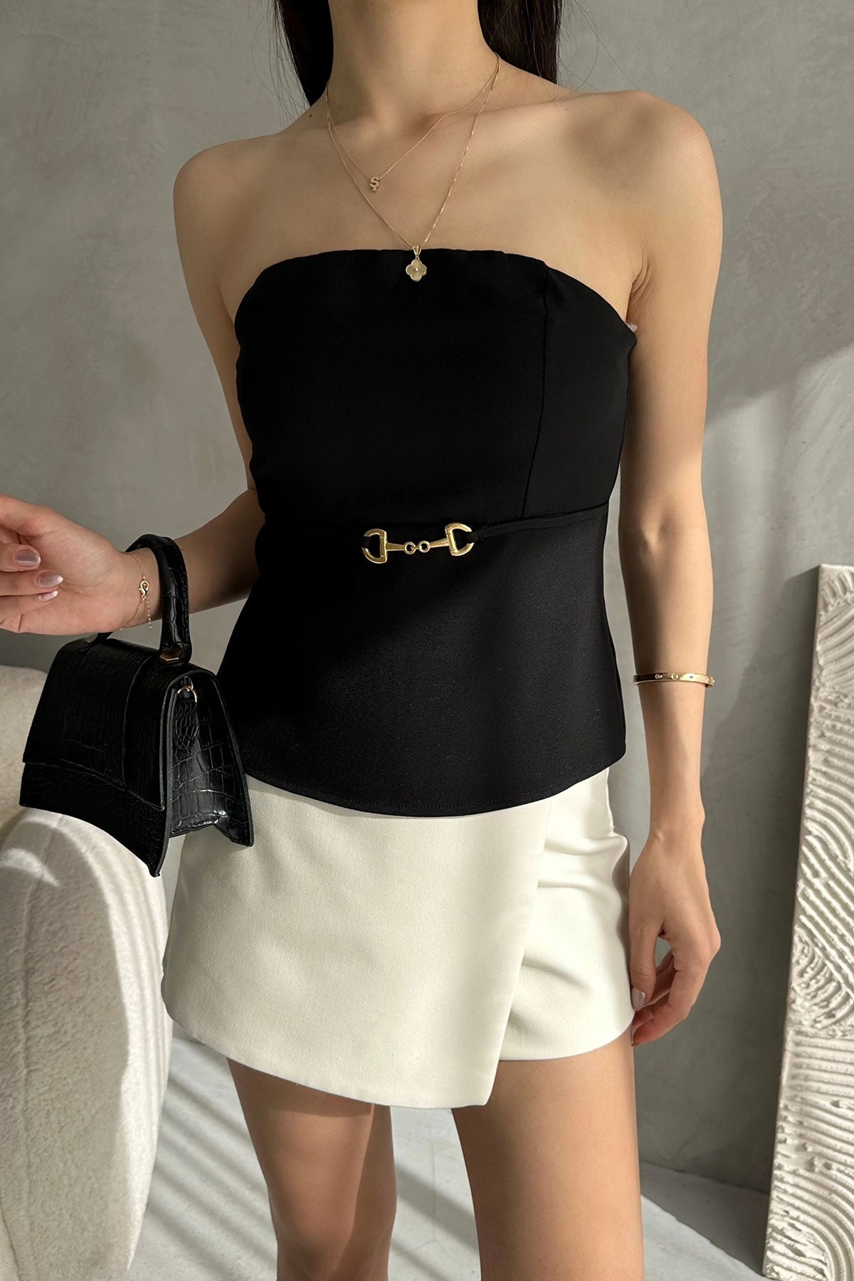 Black Strapless Fitted Thin Belt Detailed Woven Blouse