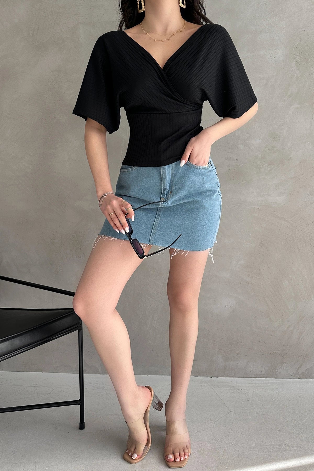 Black V-Neck Back Cross-Strap Ribbed Blouse