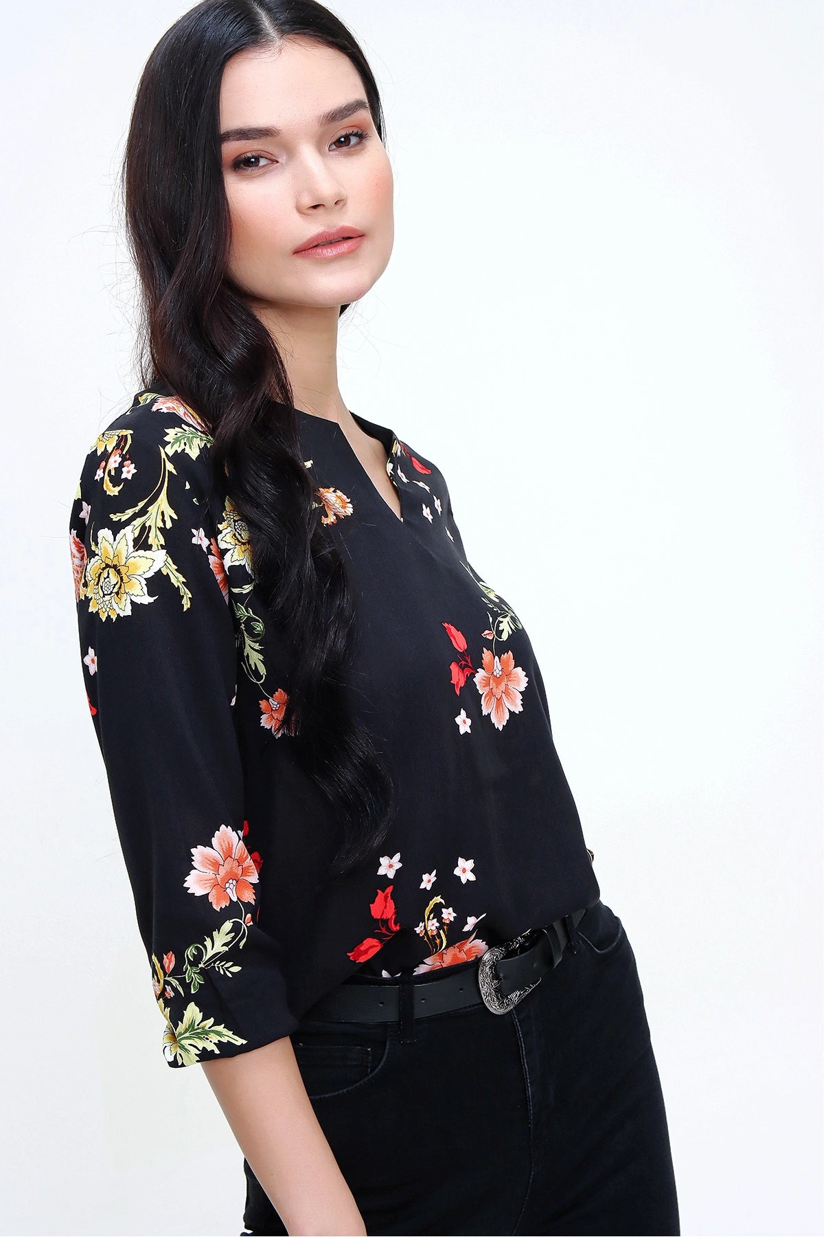 Black V-Neck Blouse with Flower Pattern BCBSK-25700-T4009-5200 - Berwyn