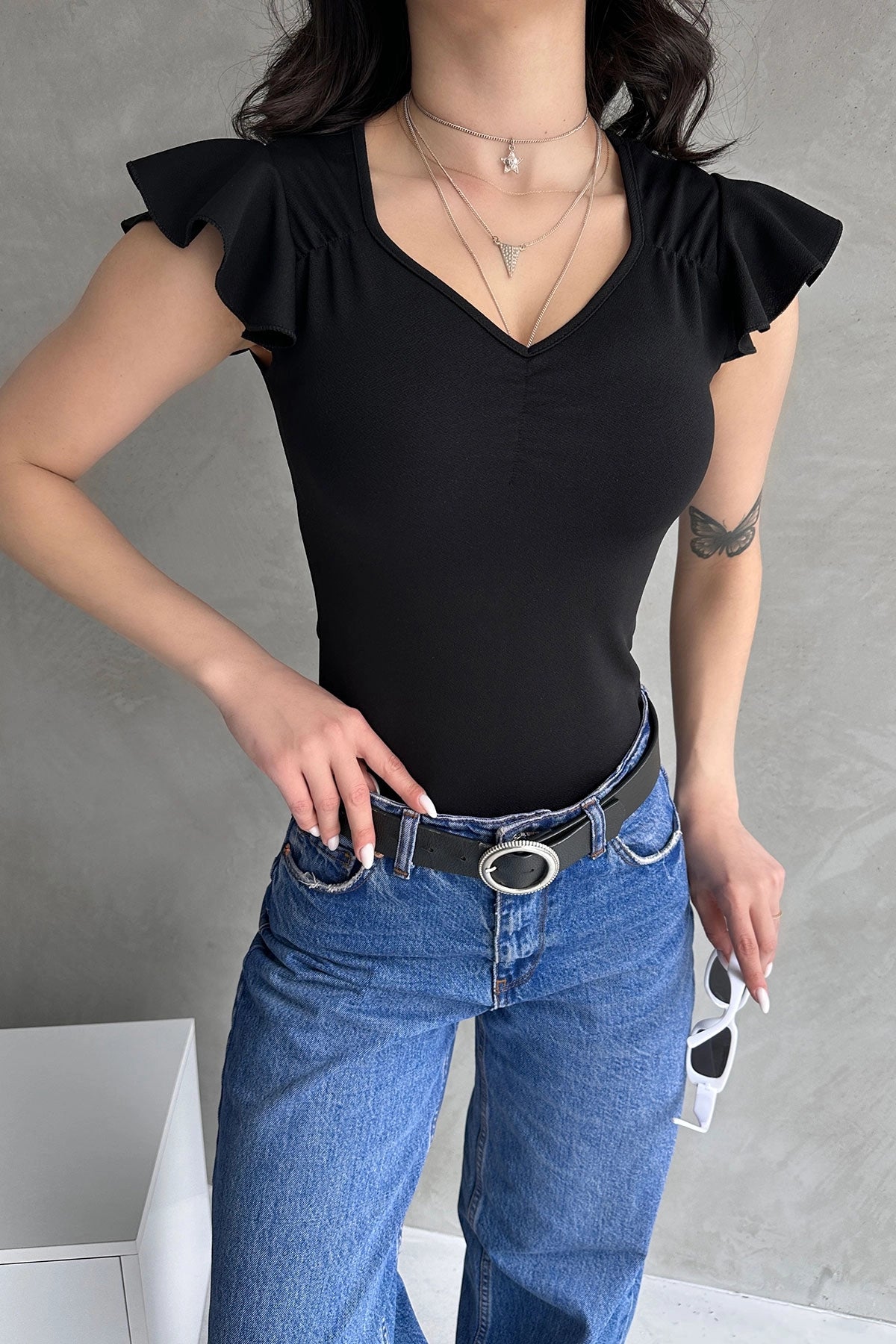Black V-Neck Crepe Blouse with Ruffle Detail BCDF-252168 - Póvoa de Varzim