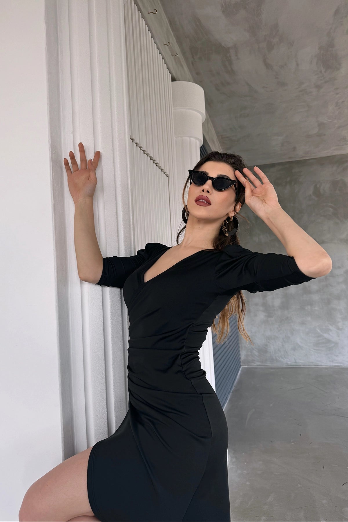 Black V Neck Envelope Skirt Midi Length Ribbed Fabric Evening Dress BCDF-241047 - Datteln