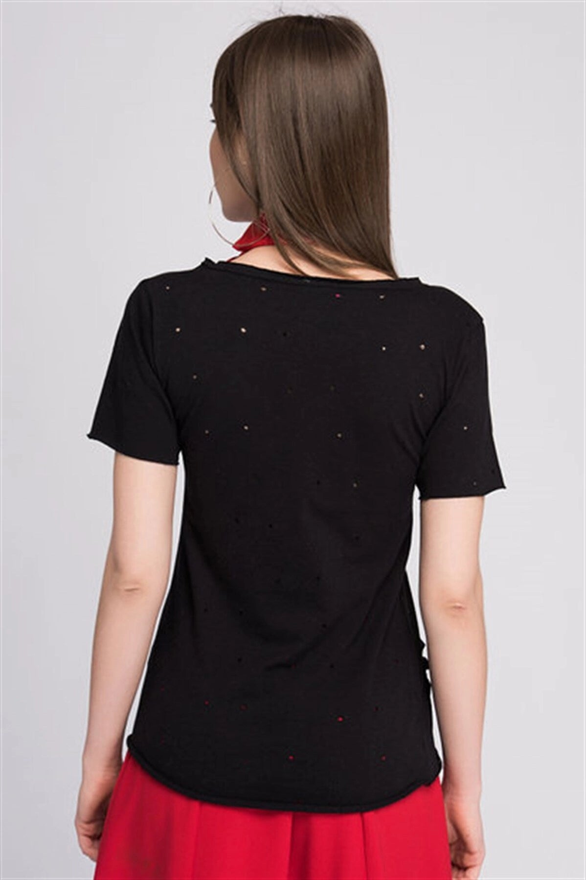 Black V Neck Printed Distressed Detail Short Sleeve T-Shirt CO-258070707 - La Rinconada