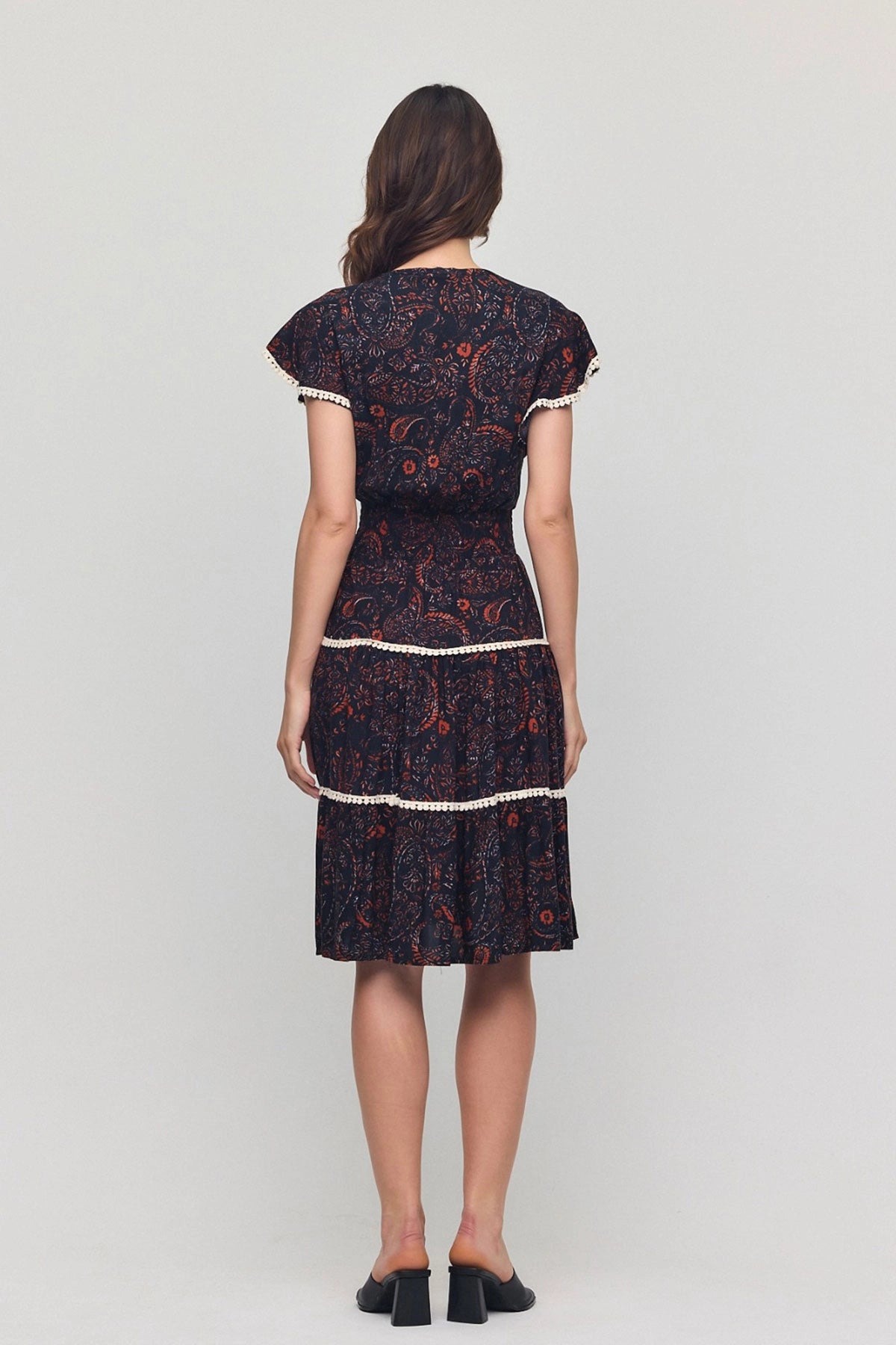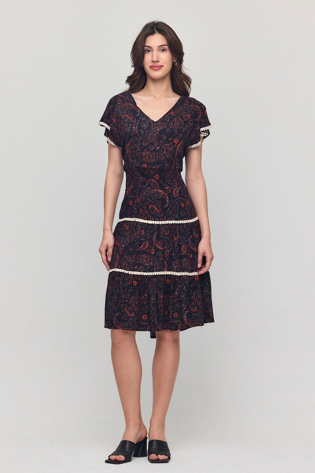 Black V-Neck Ruffled Floral Patterned Summer Viscon Dress