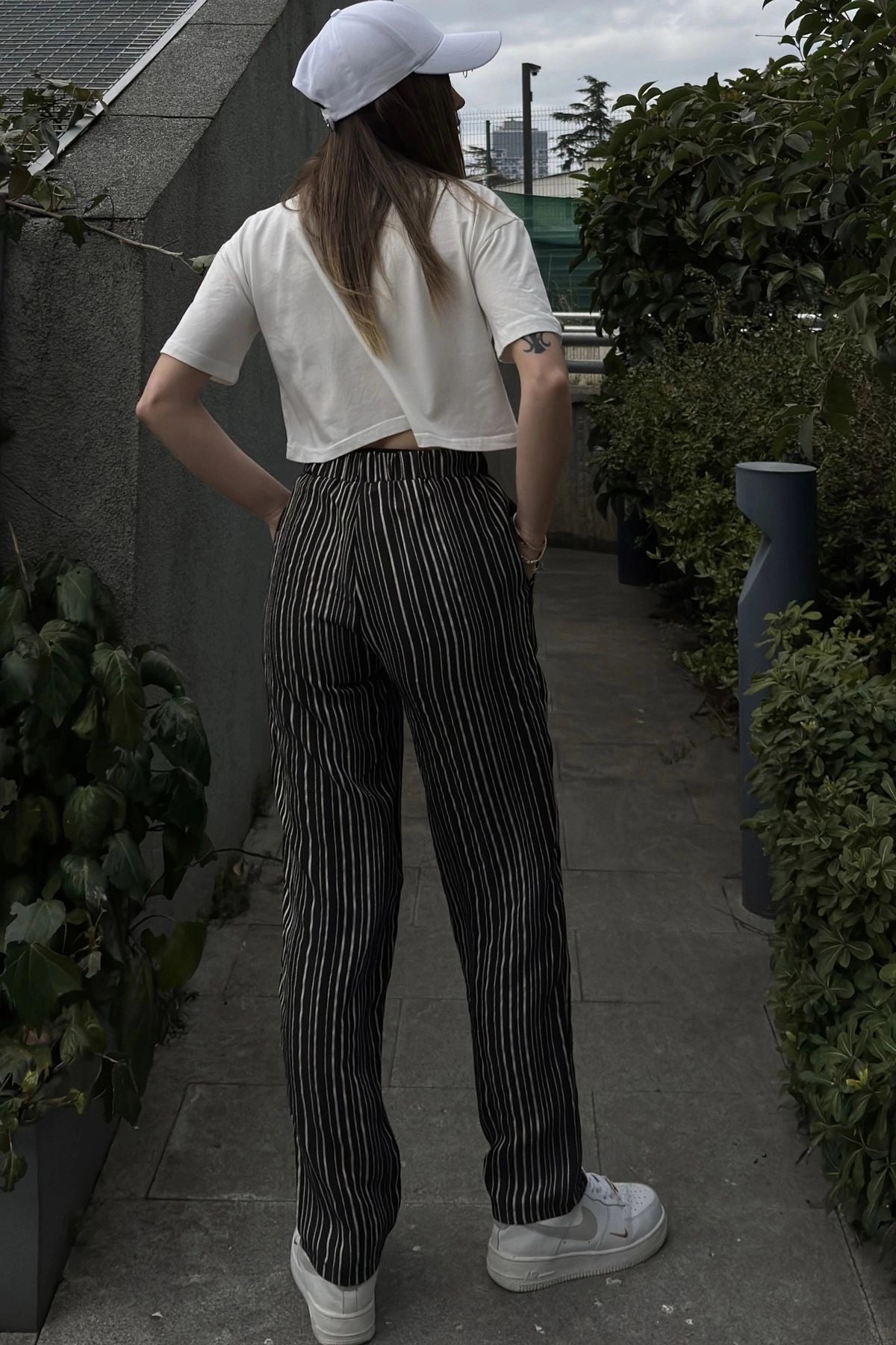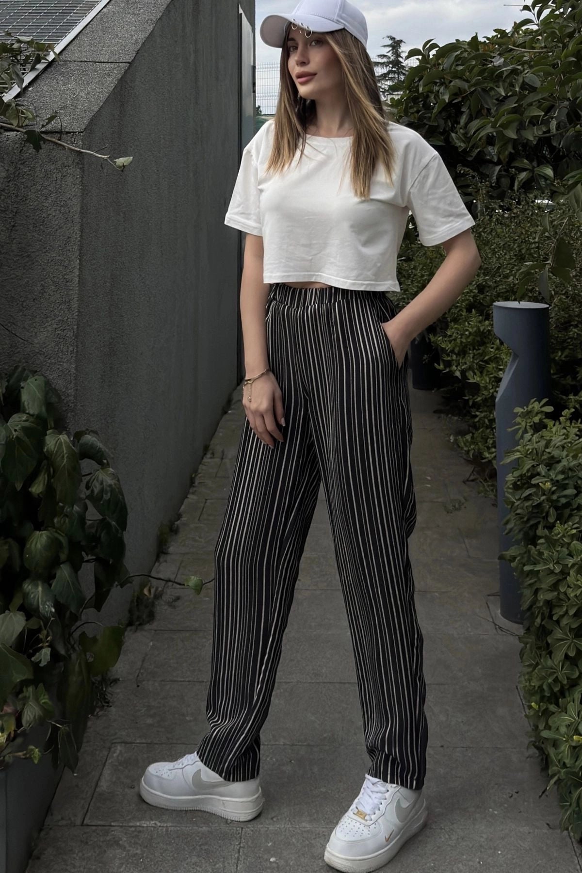 Black Wide Leg Striped Textured Trousers BCBSK-25700-3277 - Babruysk