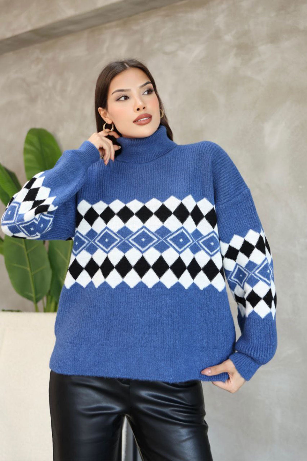 Blue Turtleneck Sweater with Striped Pattern