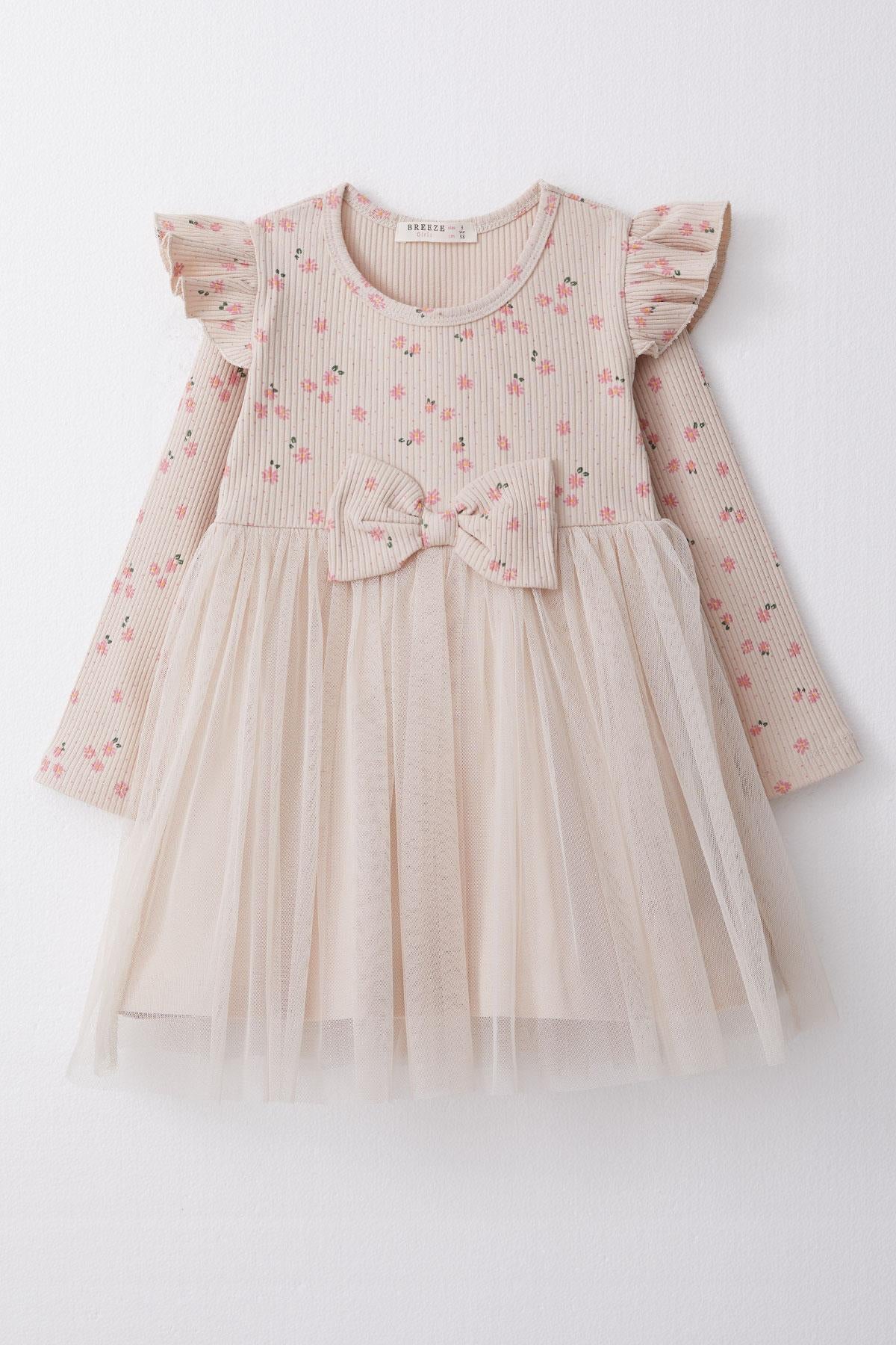 BRE Breeze Girl Child Long Sleeve Dress with Floral Bow Tulle 1.5-5 Years, Beige - Glenrothes