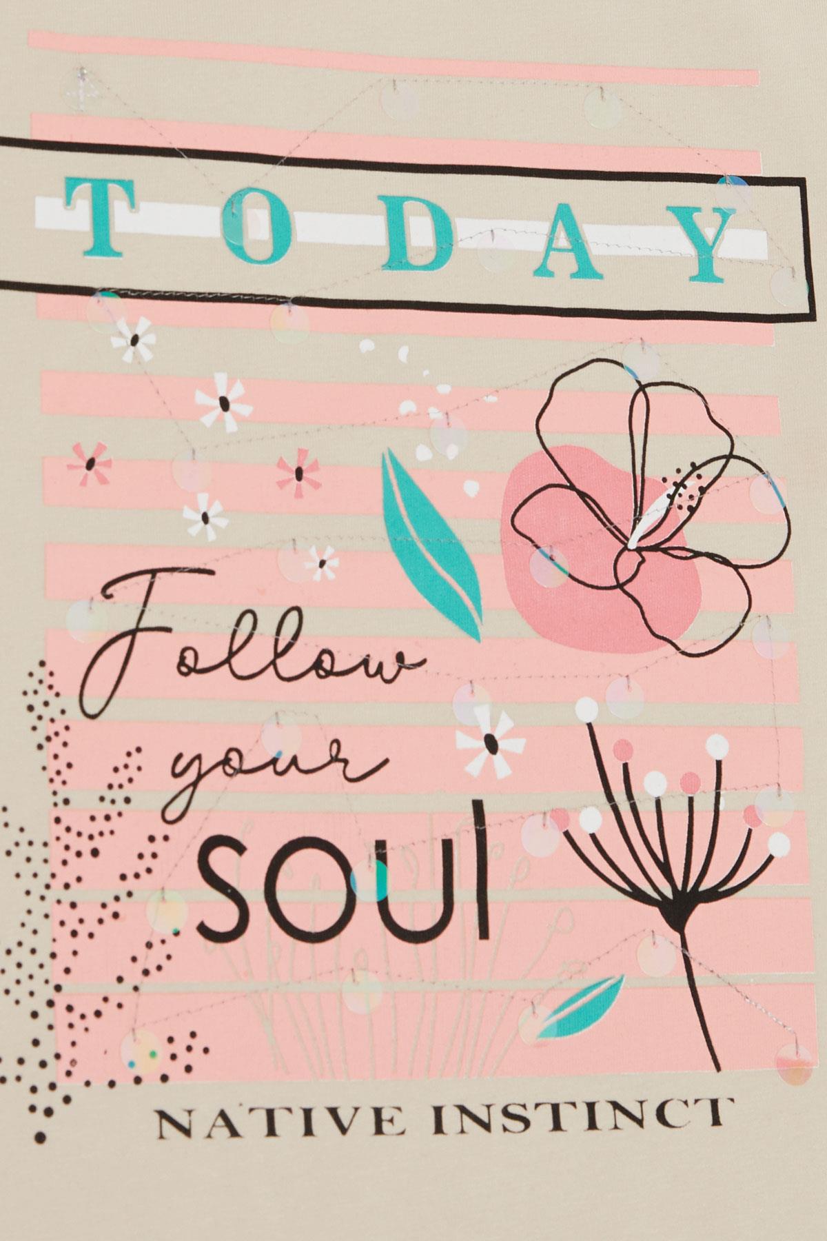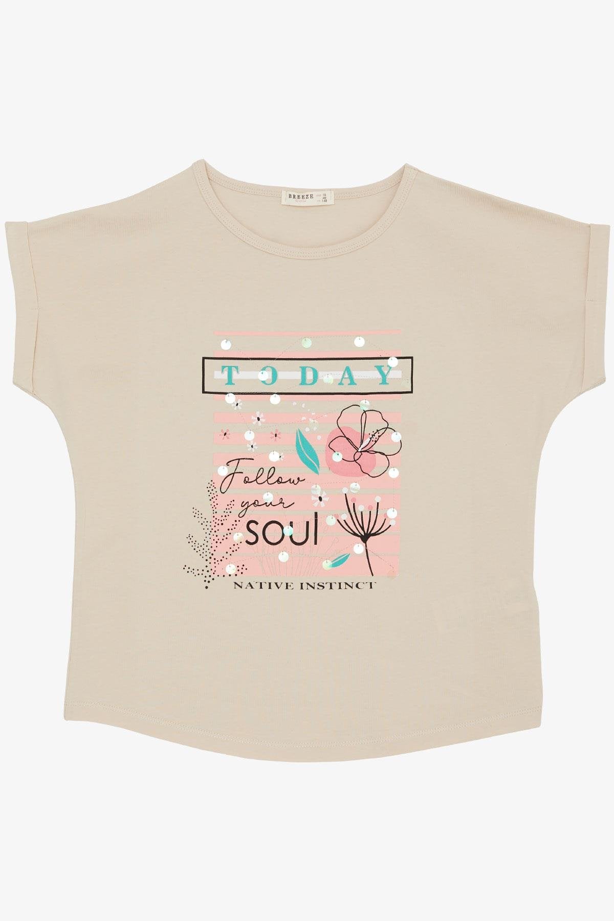 BRE Breeze Girl's T-shirt Flower & Text Printed Sequined 94 Years, Beige - Michigan City