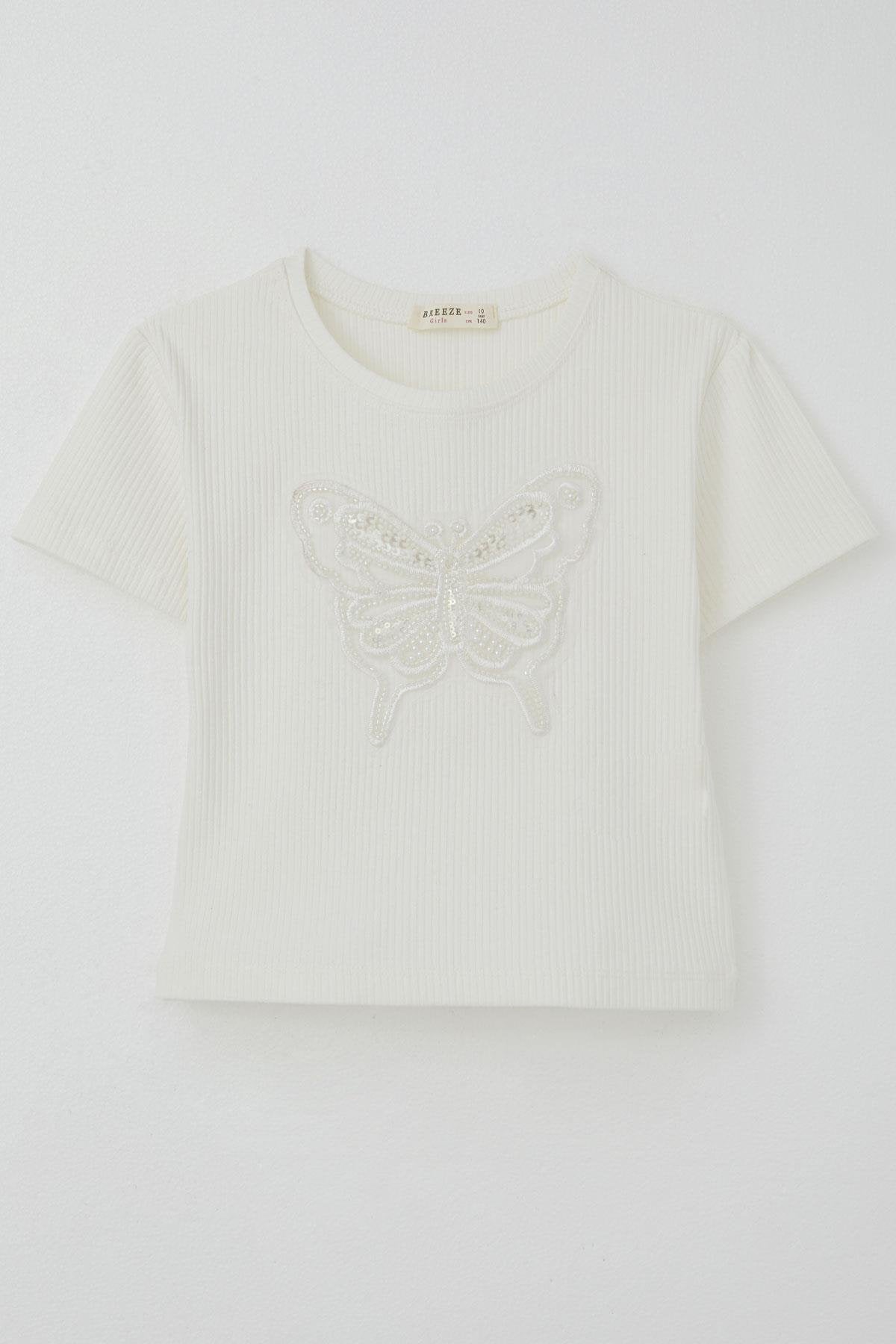 BRE Breeze Girl's T-shirt with Butterfly Crest, Pearl & Sequin Detail, 94 Years, Ecru - Épinay-sur-Seine