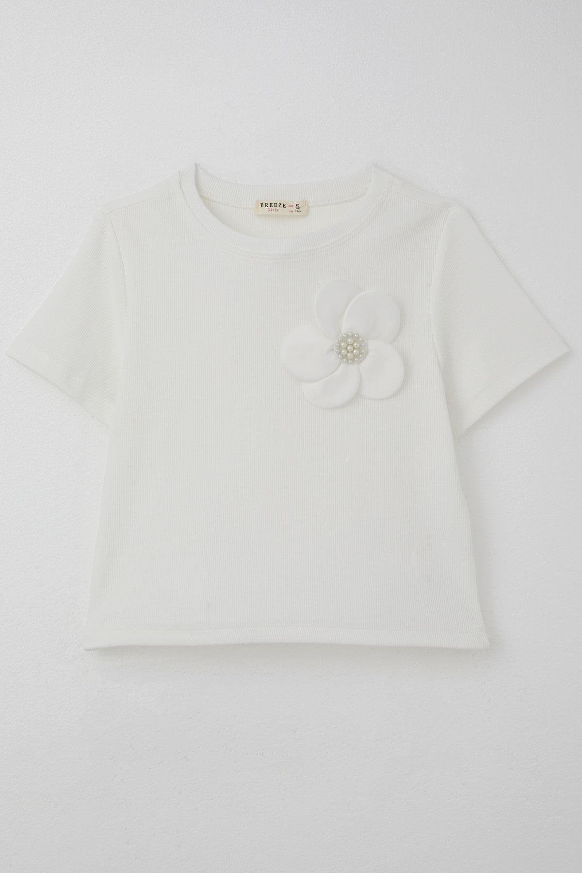 BRE Breeze Girl's T-shirt with Flower Accessories and Pearl Details, 94 Years, Ecru - Montclair