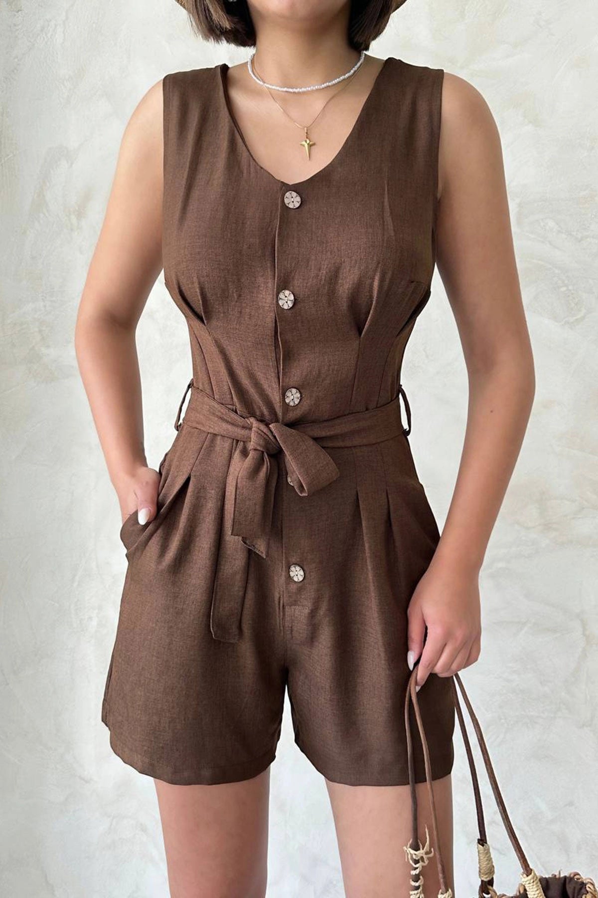 Brown Belted Pleated Buttoned Shorts Jumpsuit BCHN-25255055 - Federal Way