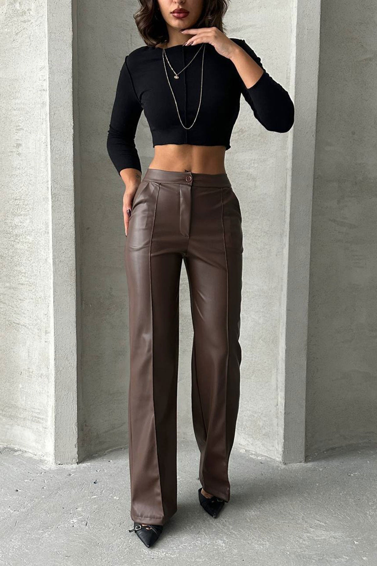 Brown Front Seam Detailed Faux Leather Palazzo Pants BCHN-2526654 - Mazara del Vallo