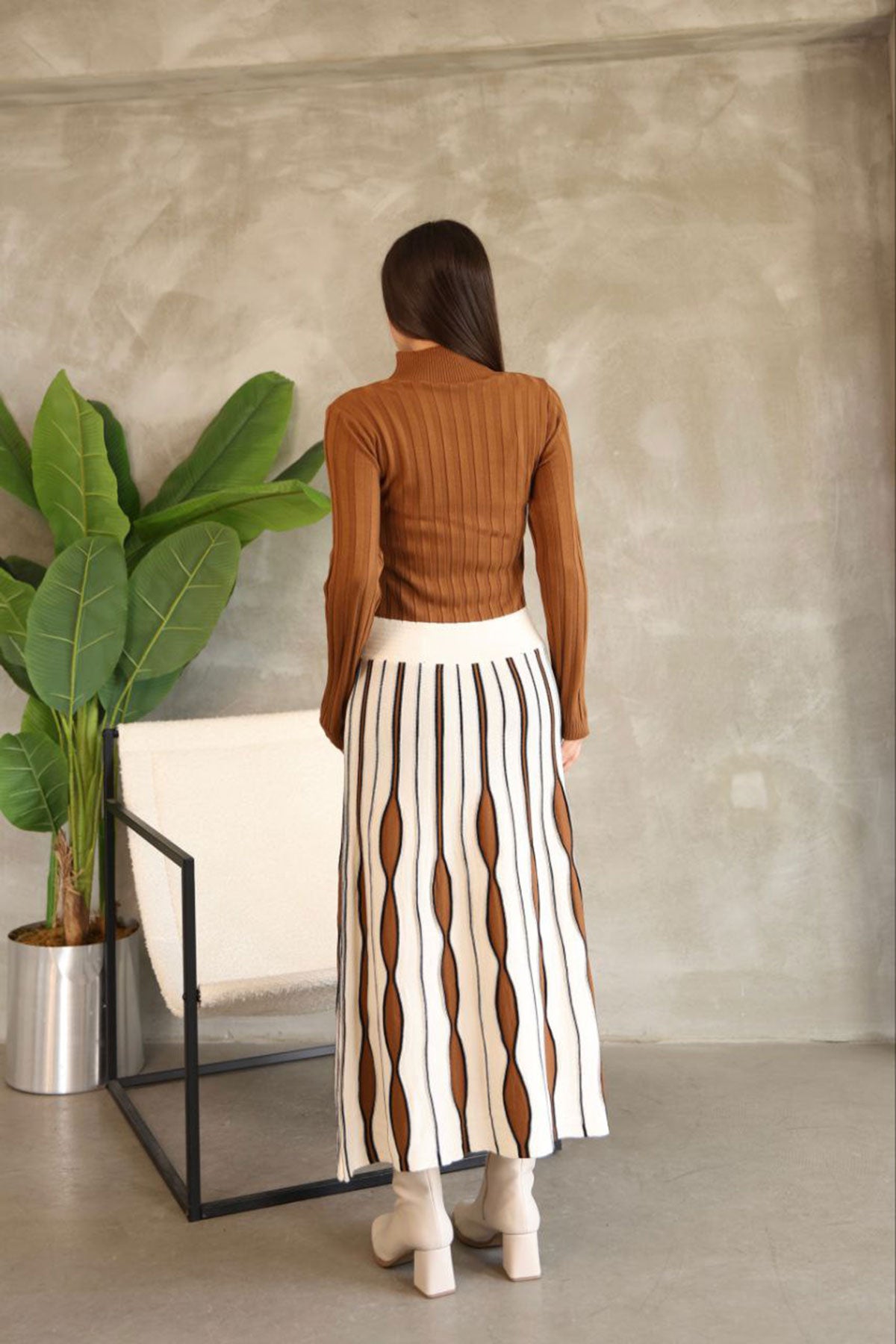 Brown High Neck Skirt-Look One-Piece Patterned Knit Dress BCES-252020 - Tamiami