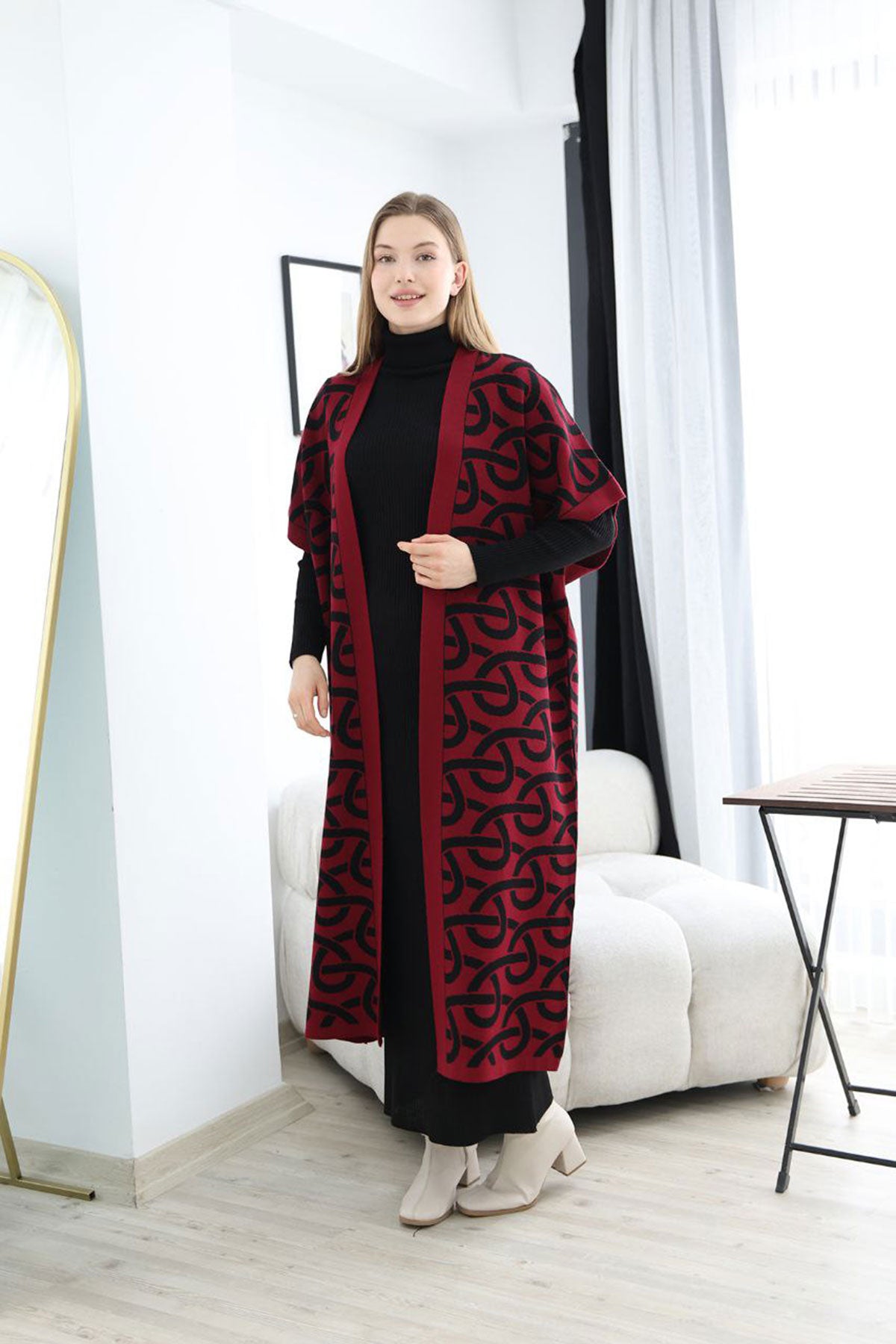 Burgundy Turtleneck Knit Dress and Long Patterned Cardigan Set BCES-252040 - Scandicci