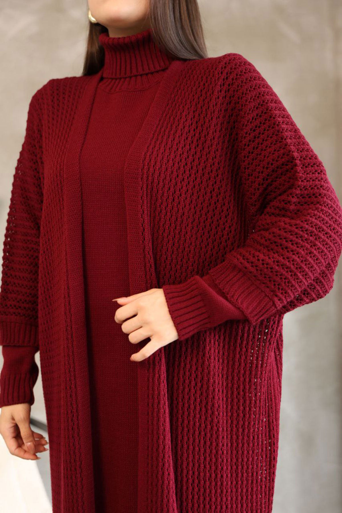 Burgundy Turtleneck Long Sleeve Knit Dress and Long Cardigan Hijab Top Bottom Knit Set BCES-252039 - Izmail
