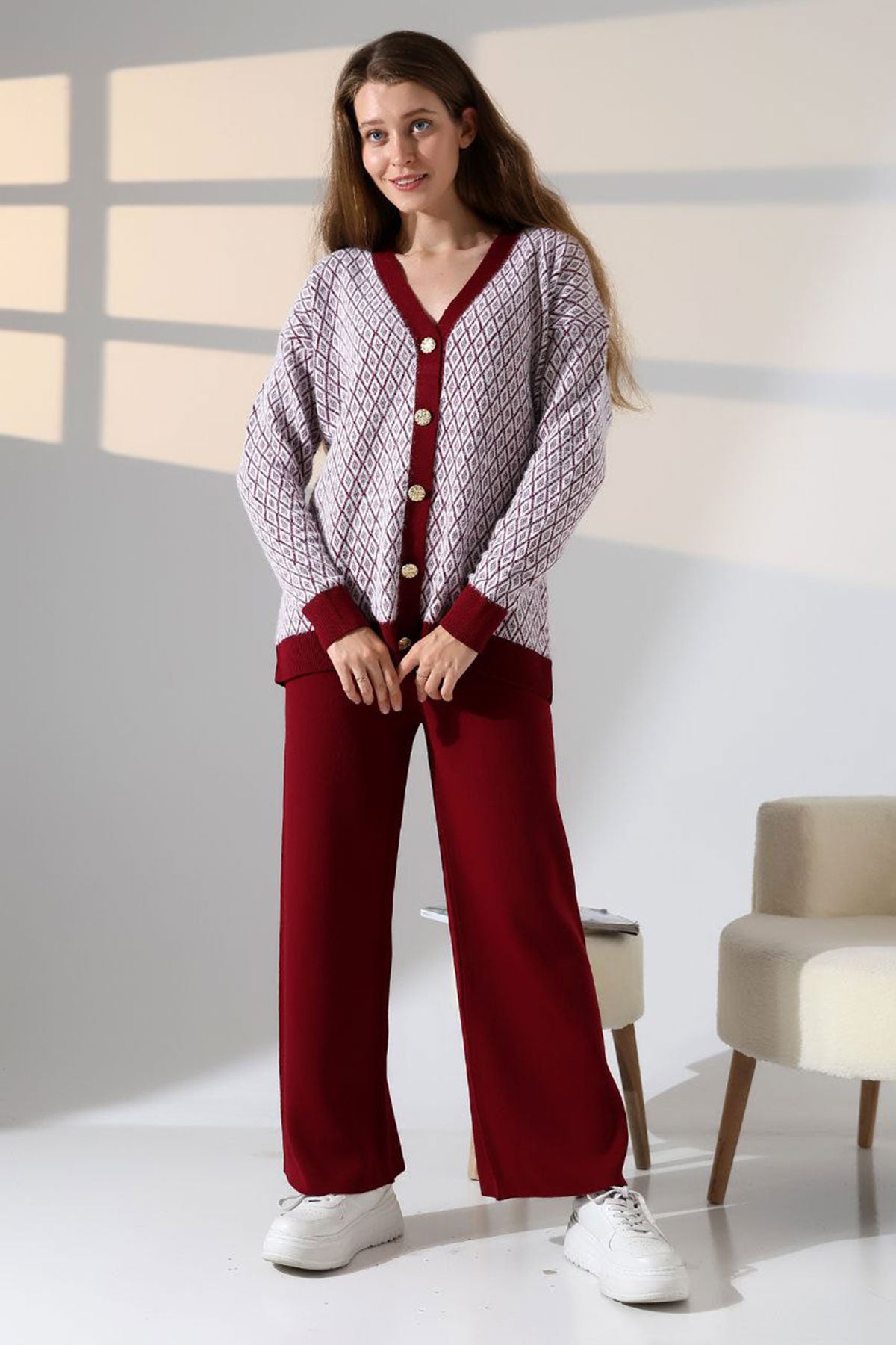 Burgundy V-Neck Buttoned Cardigan and Pants Top Bottom Knit Set BCES-252011 - Chetumal