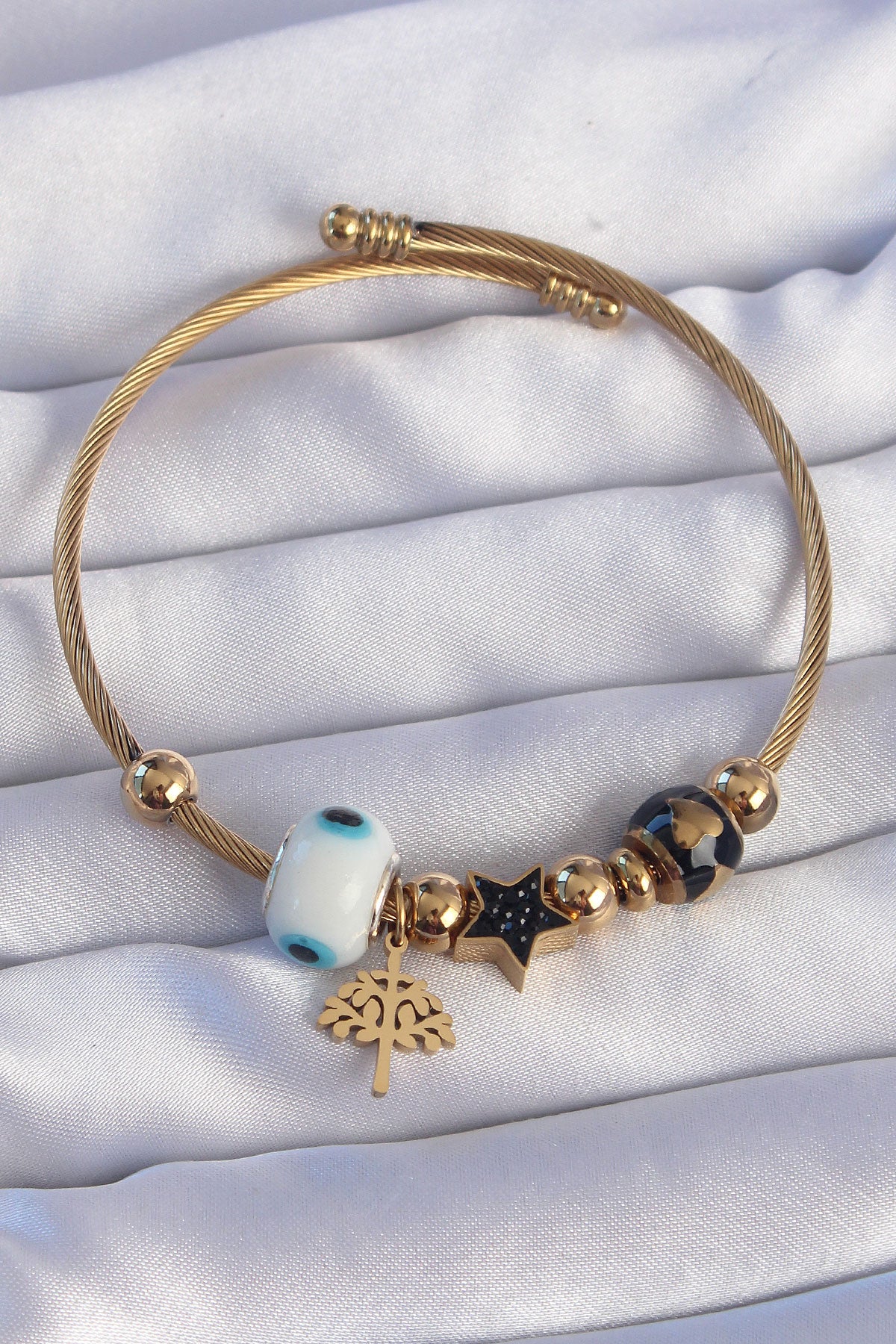 EBJ 316L Steel Gold Color Black Zircon Stone Star Design Tree Detail Evil Eye Charm Bracelet - Châtenay-Malabry