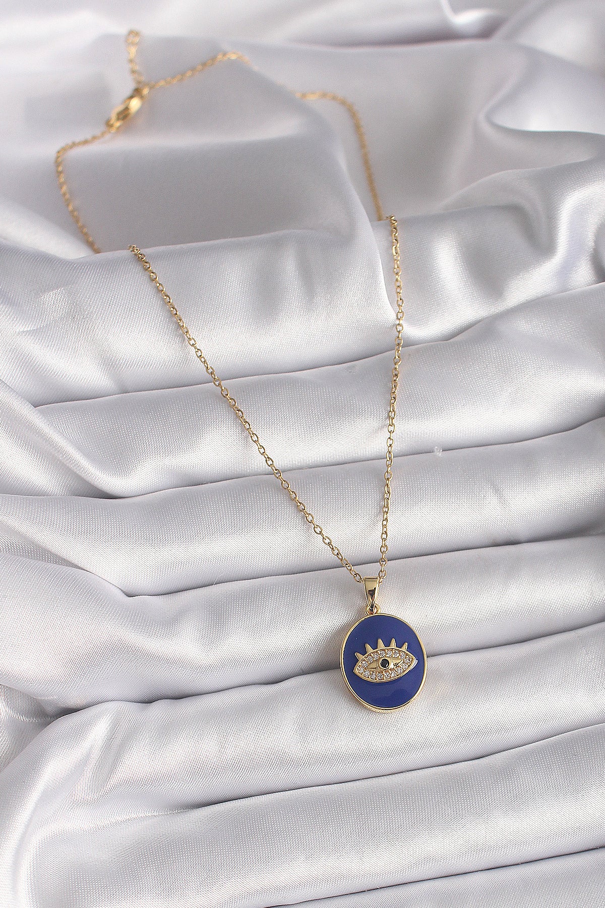EBJ 316L Steel Gold Color Chain Blue Enamel Zircon Stone Eye Processing Women's Necklace - Oro Valley