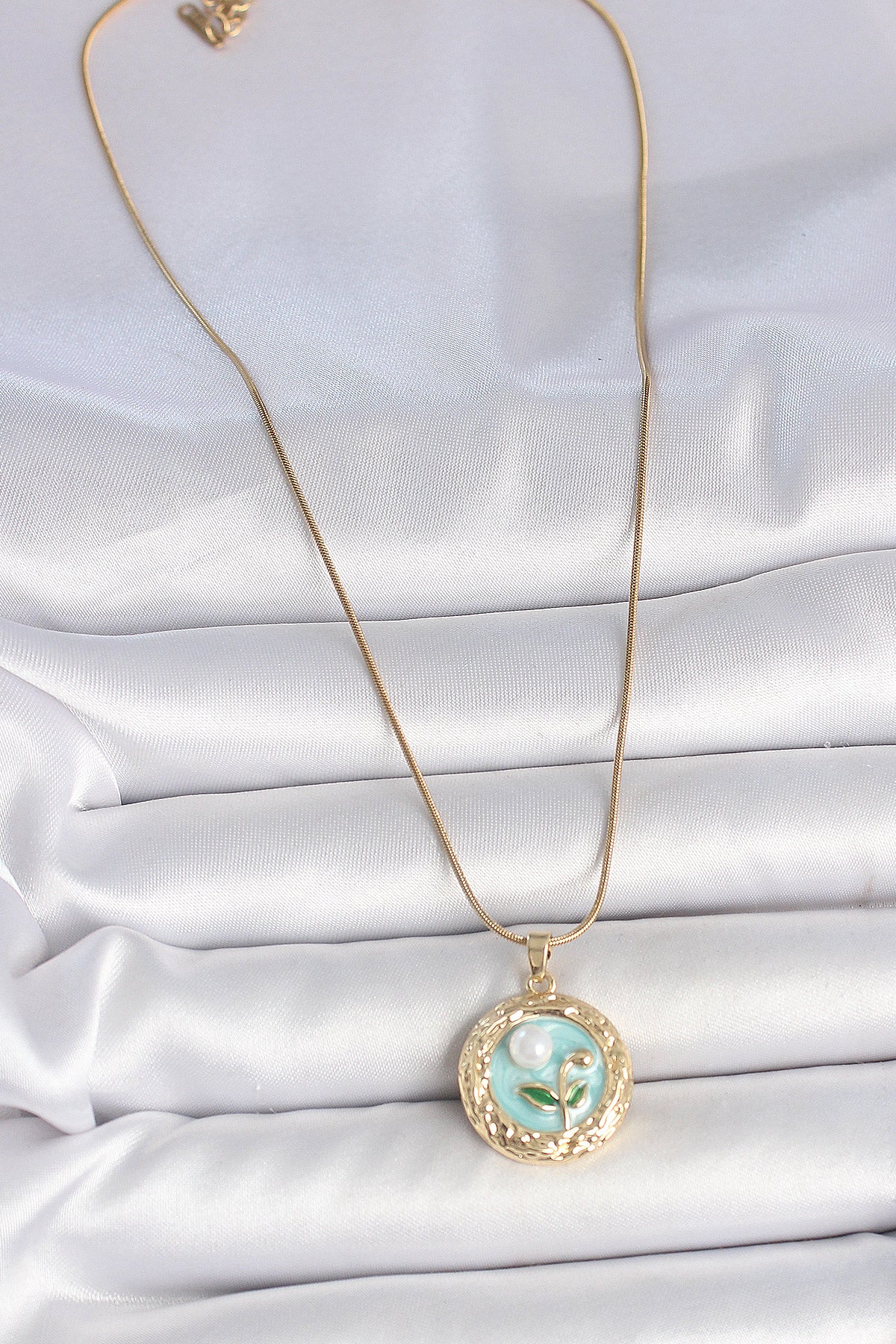 EBJ 316L Steel Gold Color Chain Blue Flower Embellished Pearl Detail Portrait Model Women's Necklace - Gulfport