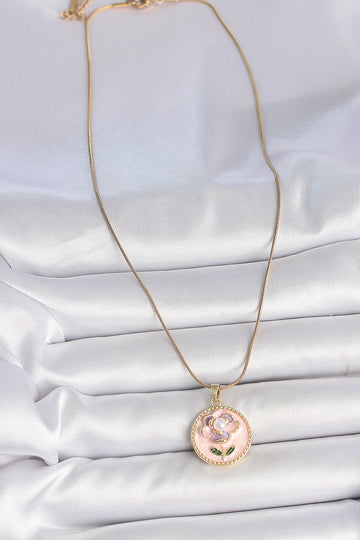 EBJ 316L Steel Gold Color Chain Pink Flower Embroidered Pearl Detail Portrait Model Women's Necklace - Jiutepec