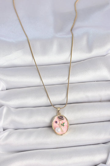 EBJ 316L Steel Gold Color Chain Pink Flower Embroidered Pearl Detail Portrait Model Women's Necklace - Venlo