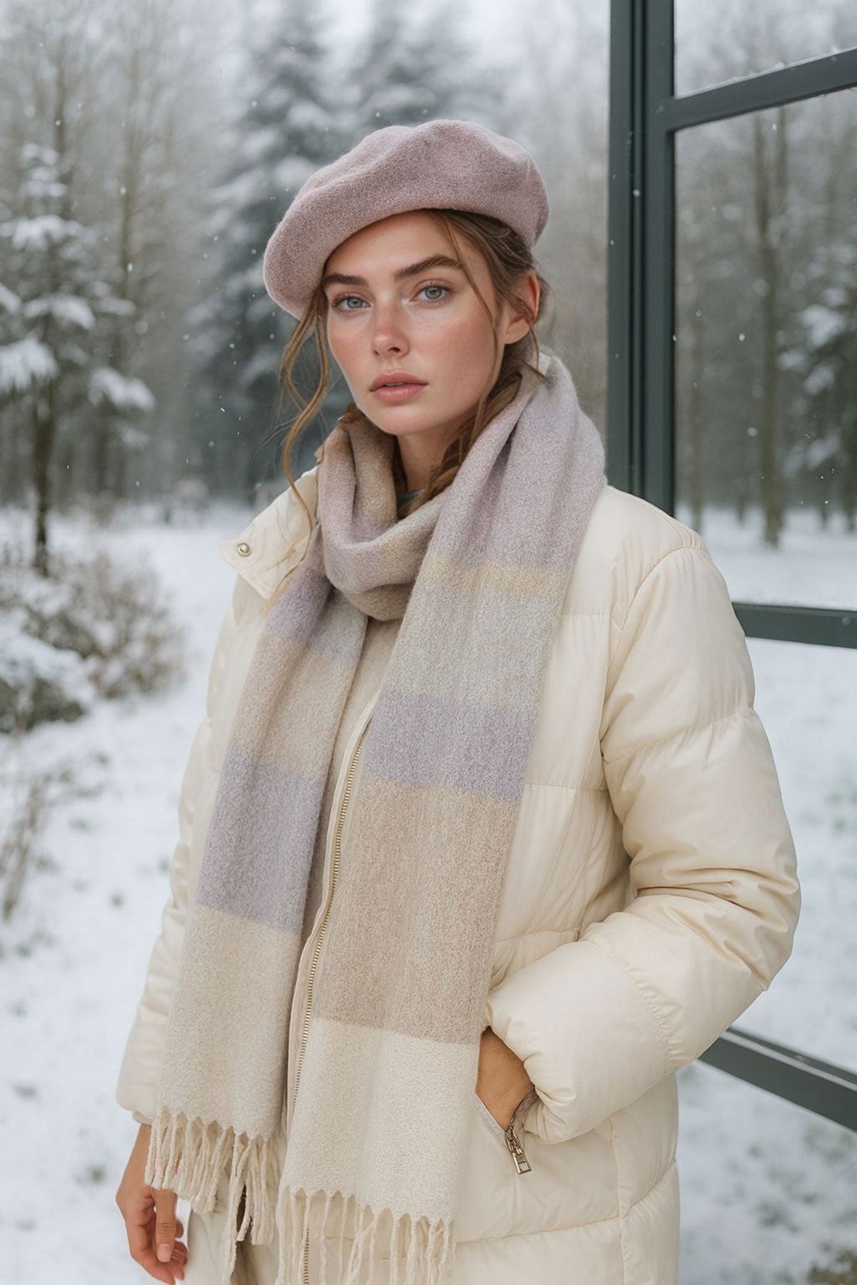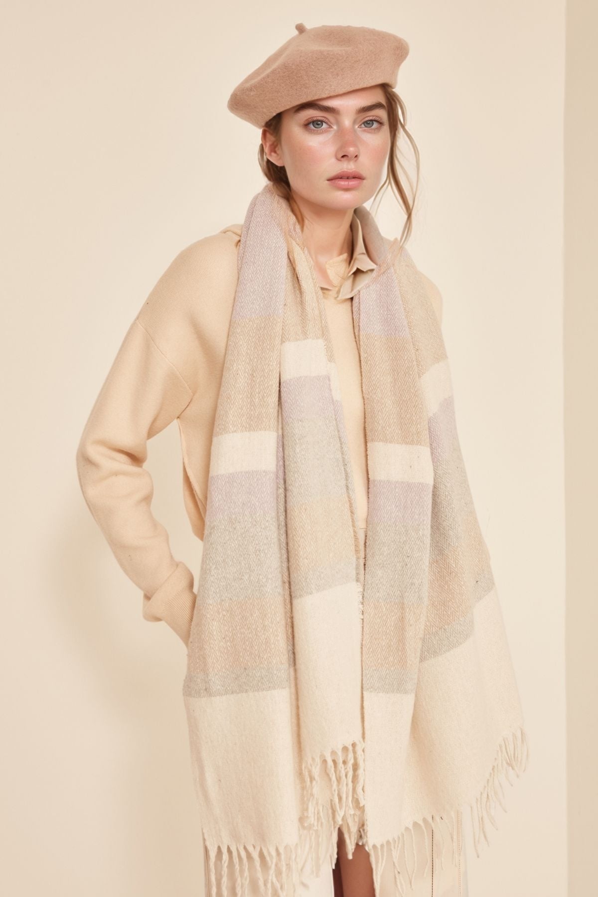Ecru-Anthracite Reversible Thick Shoulder Shawl Scarf
