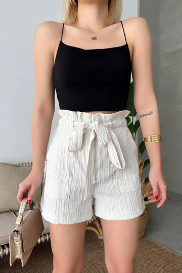 Ecru Belted Ruffled Waistband Detailed Elastic Shorts BCHN-2525265 - Aalen