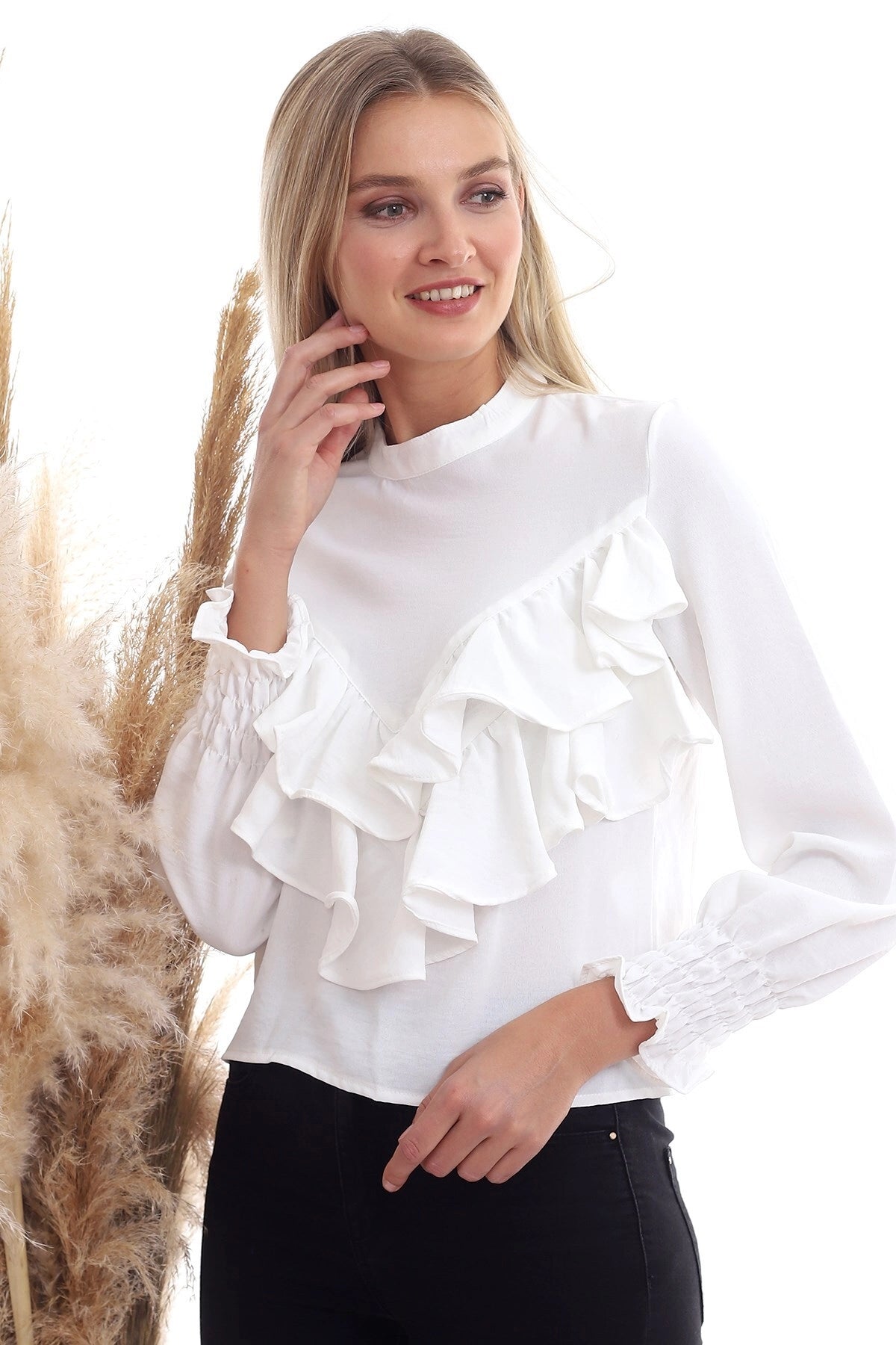 Ecru Bicycle Neck Ruffled Long Sleeve Woven Blouse