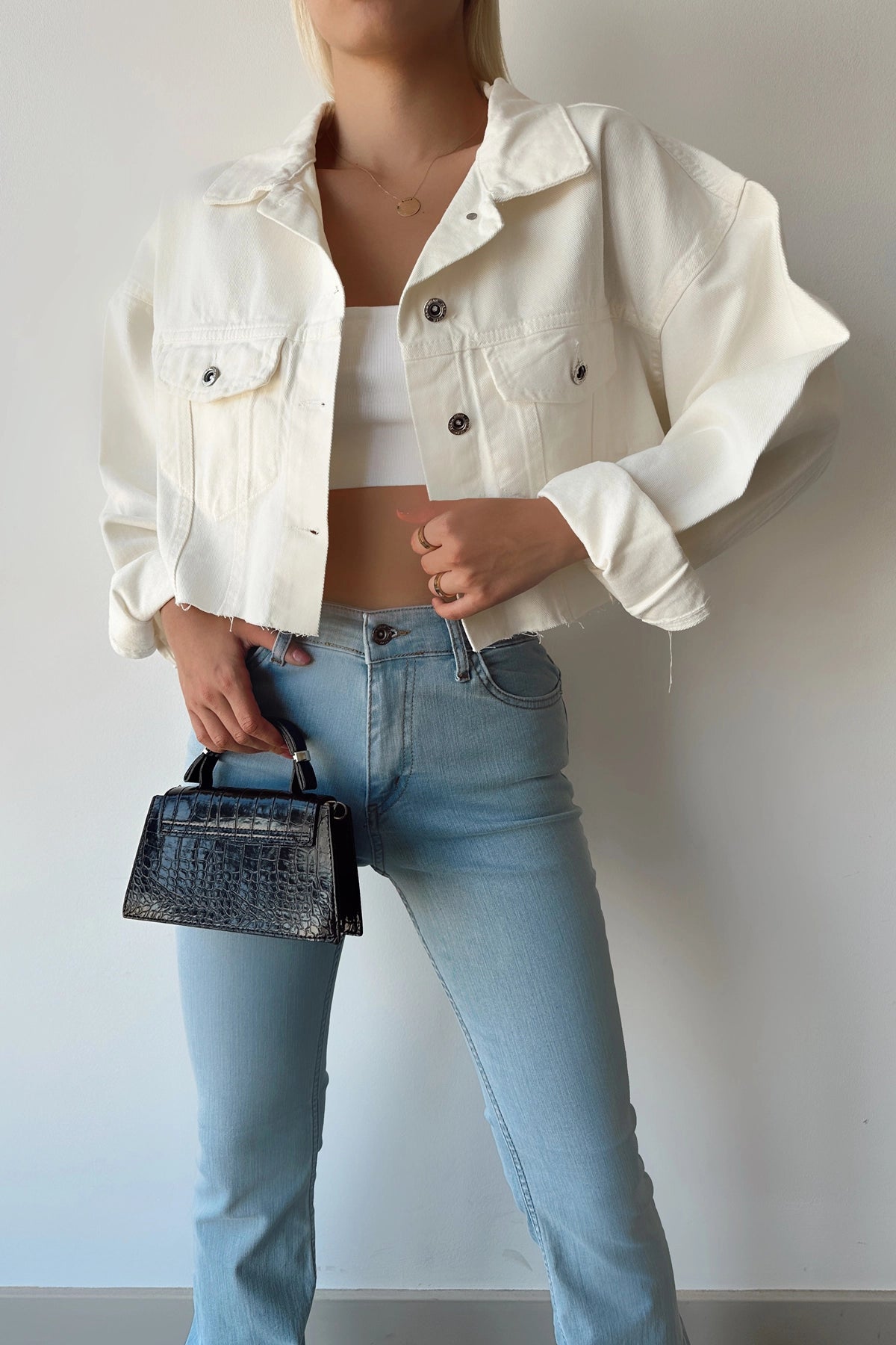Ecru Double Pocket Laser Cut Washed Crop Denim Jacket