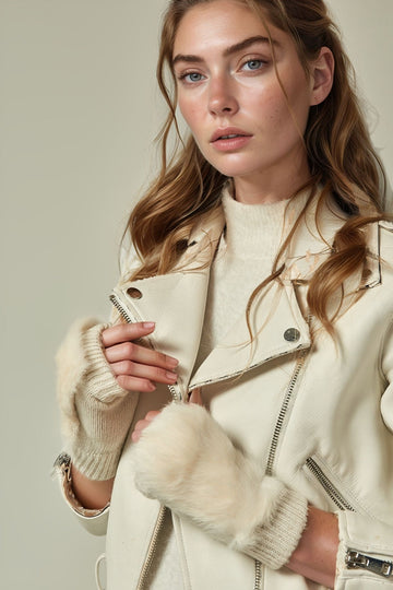 Ecru Artificial Fur Woolen Fingerless Gloves