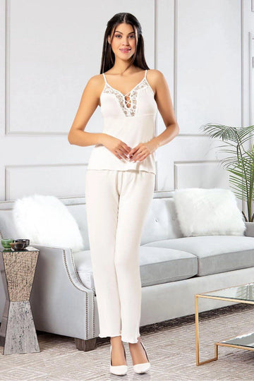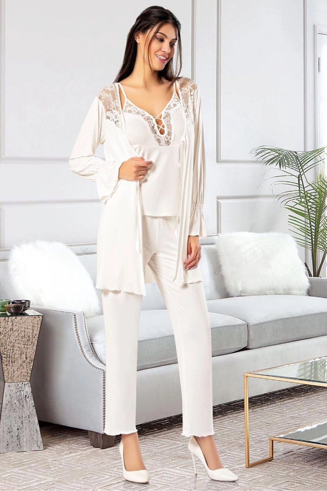 Ecru Lace Detailed Three-Piece Pajama Set BCAN-258903FA - Ocotlán