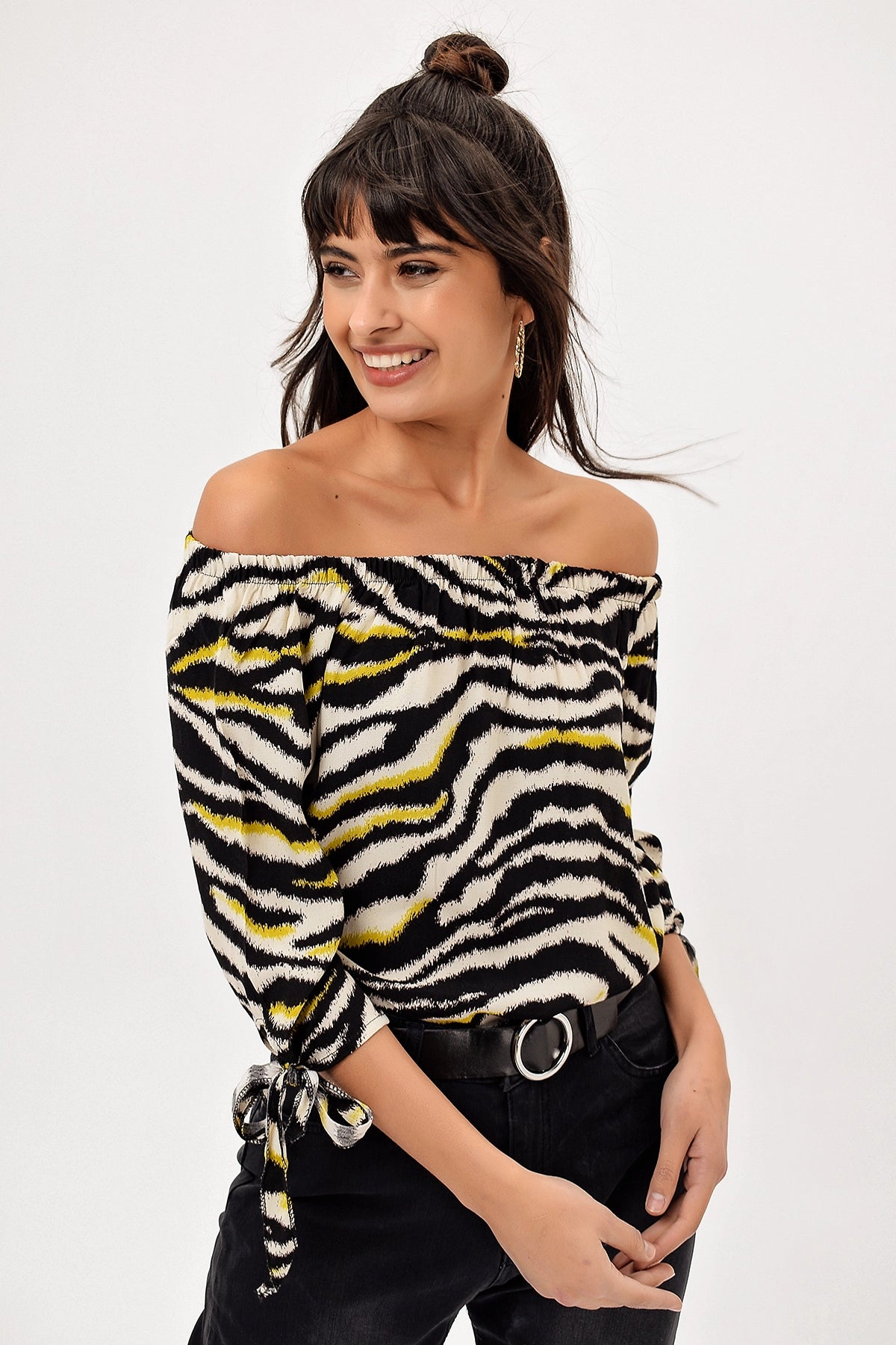 This ecru colored strapless neckline blouse is an elegant and stylish option. This blouse, featuring a trumpet sleeve design, is adorned with ruched details on the sleeves. Thanks to its regular fit and standard length, it fits every body type. The fabric content of this blouse is 95% viscose and 5% elastane. Viscose is a soft and breathable fabric type that prioritizes clothing comfort. Elastane adds flexibility and freedom of movement to the blouse, allowing you to move comfortably. Ecru color is a sophisticated choice that adds a nice touch to this blouse. This neutral color can be used in various combinations and can adapt to different styles. The strapless neckline design showcases your shoulders beautifully while providing a feminine look. The trumpet sleeve design of the blouse is a modern and stylish detail. This detail adds dynamism to the blouse and helps you move away from ordinariness. The ruched details on the sleeves add volume and movement to the blouse, emphasizing your style. This blouse is a versatile piece that you can easily choose for daily life, special events, or going out at night. You can make this blouse, which reflects your style and makes you feel free, a staple in your wardrobe.