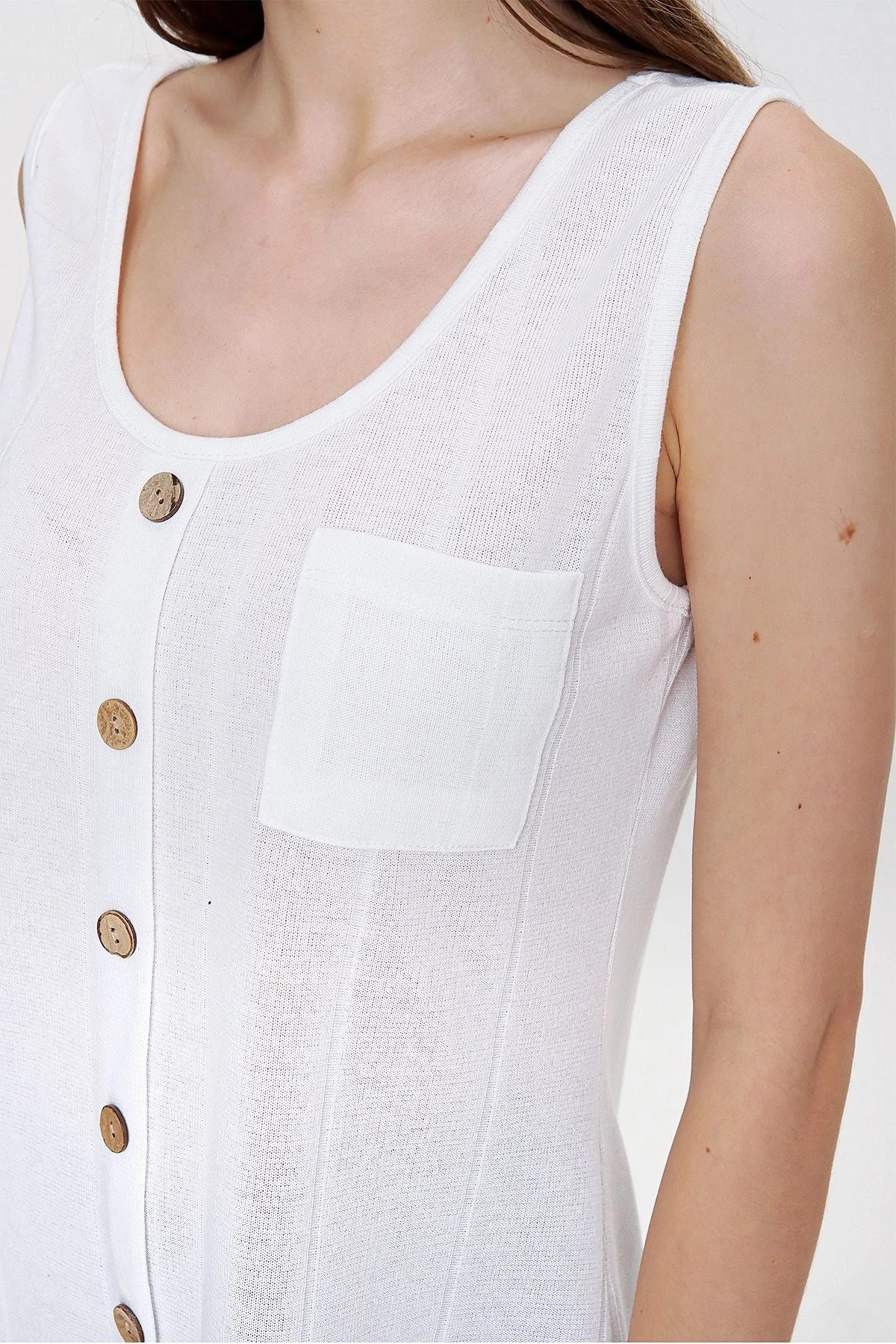 Ecru Sleeveless Buttoned Thin Knit Sweater Blouse BCBSK-25700-3134 - Antibes