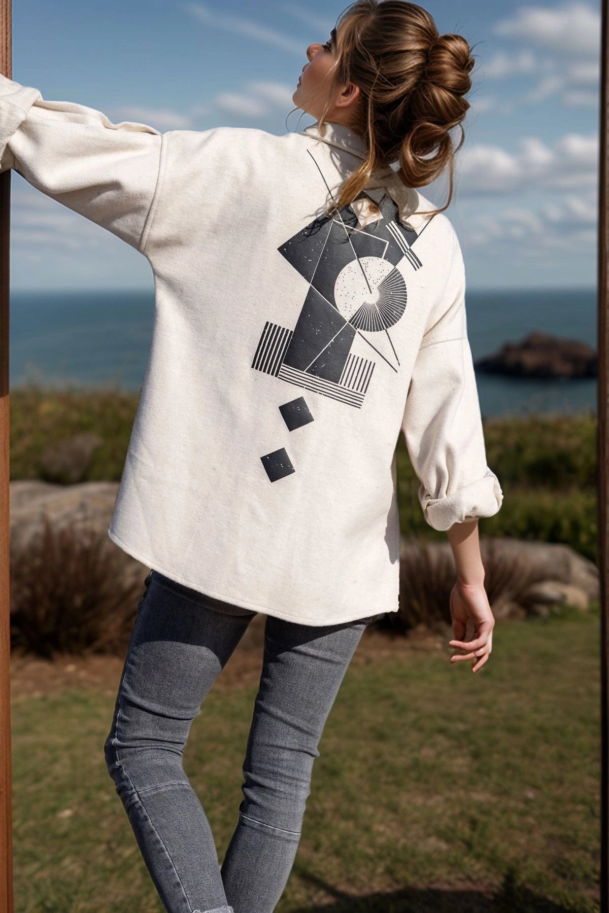 Ecru Stone Leather Trimmed Back Printed Stamp Oversized Jacket Shirt BCBSK-25700-3289 - Coventry