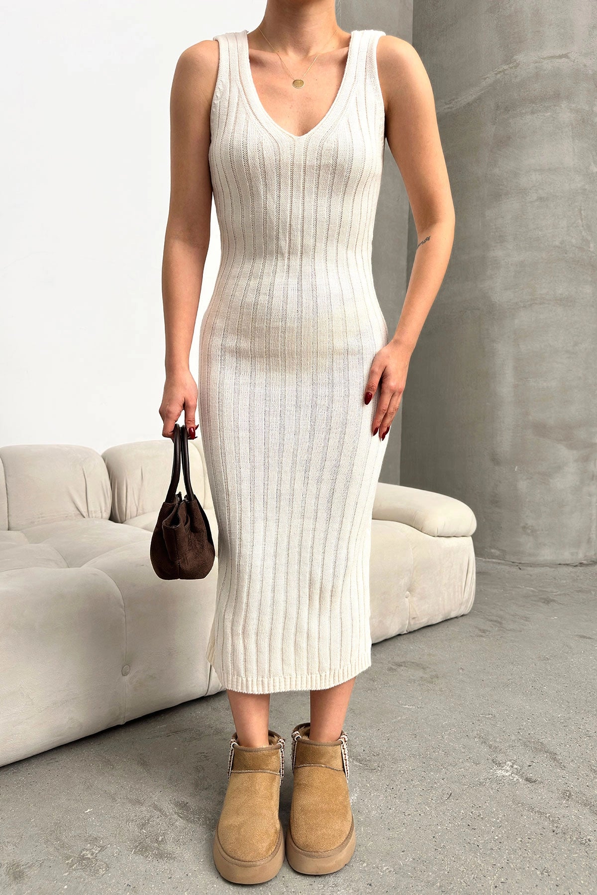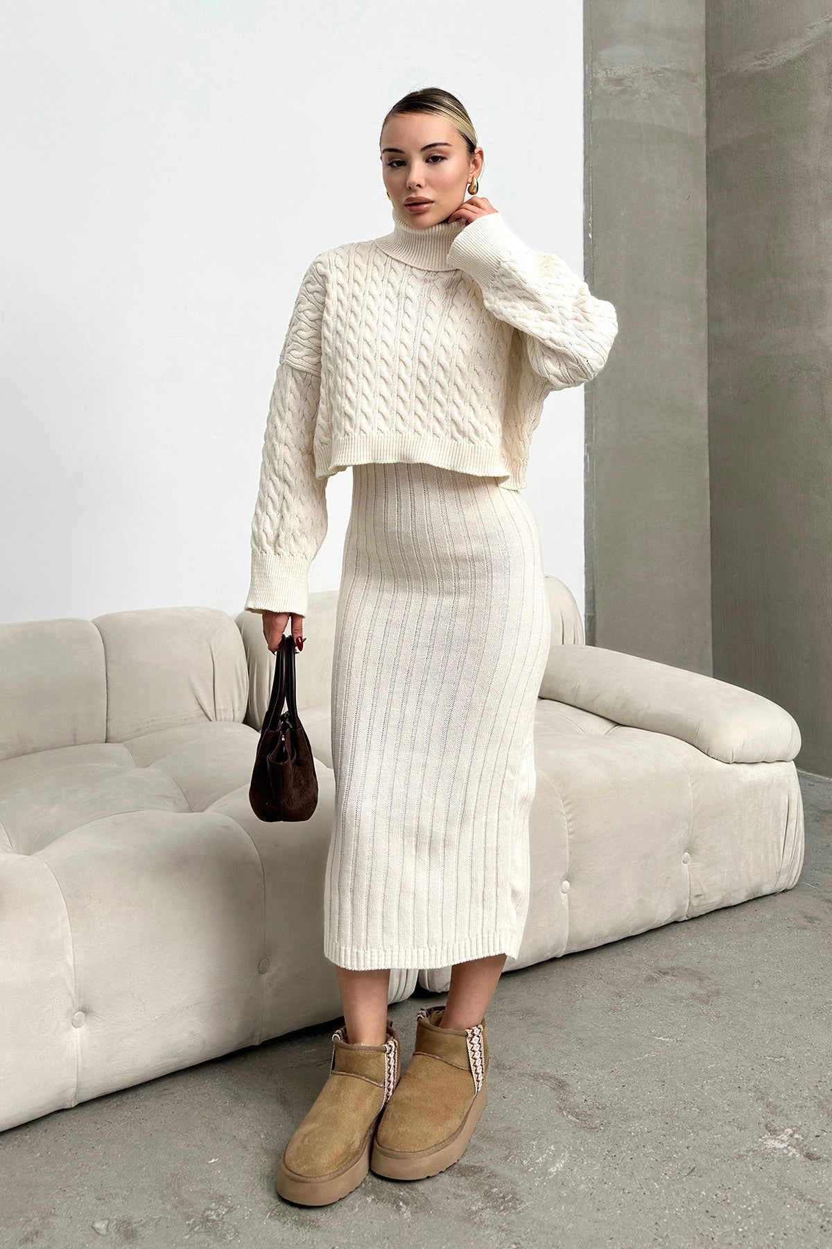 Ecru Turtleneck Knitted Crop Sweater and Dress Set with Cable Pattern BC231004 - Yucaipa