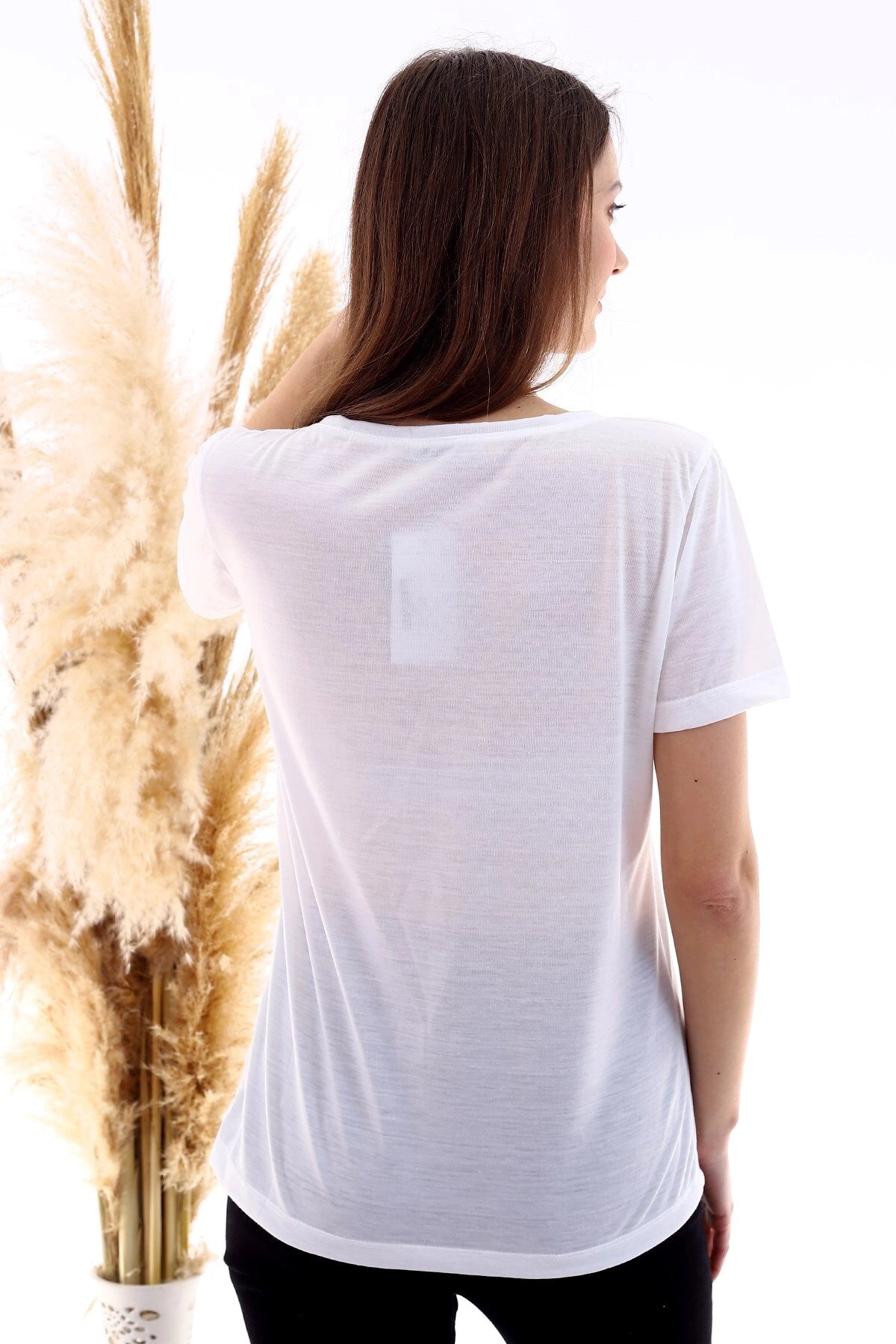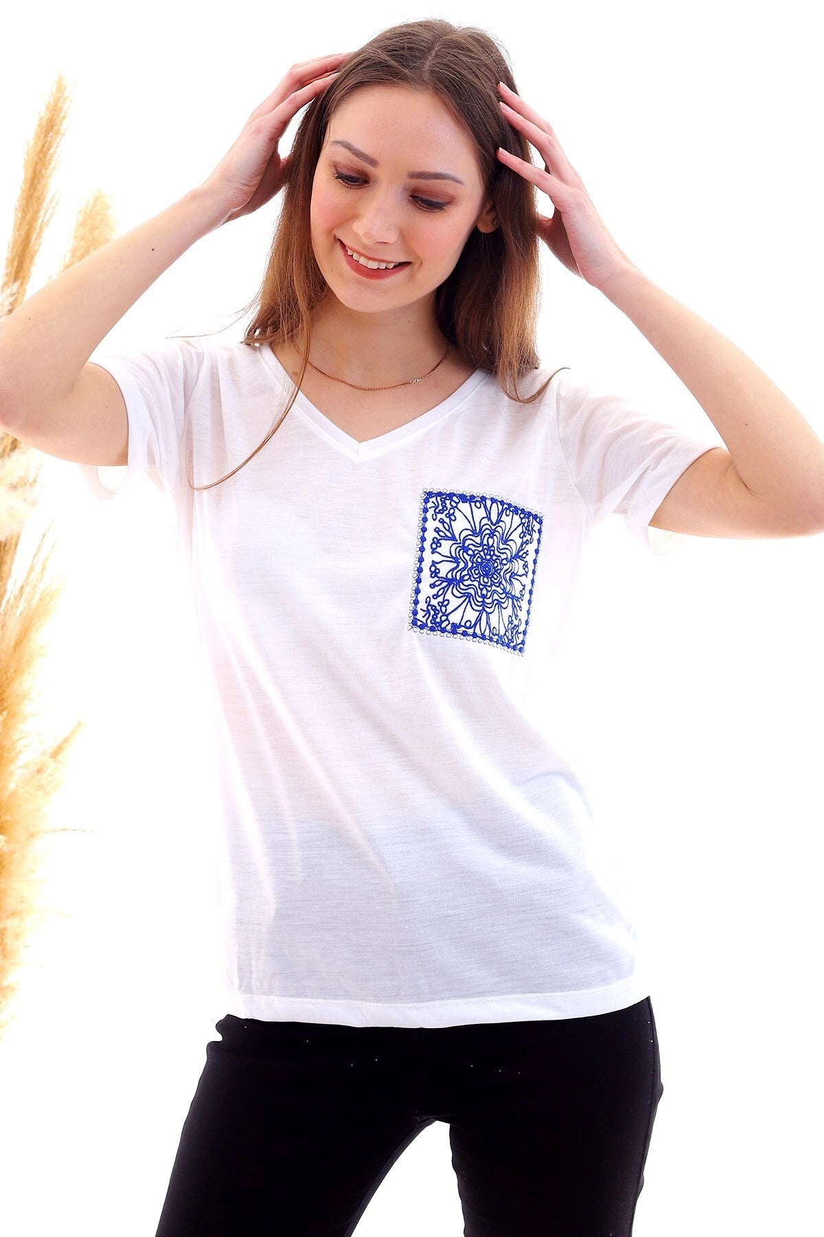 Ecru V-Neck Short Sleeve Pocket Embroidered T-Shirt